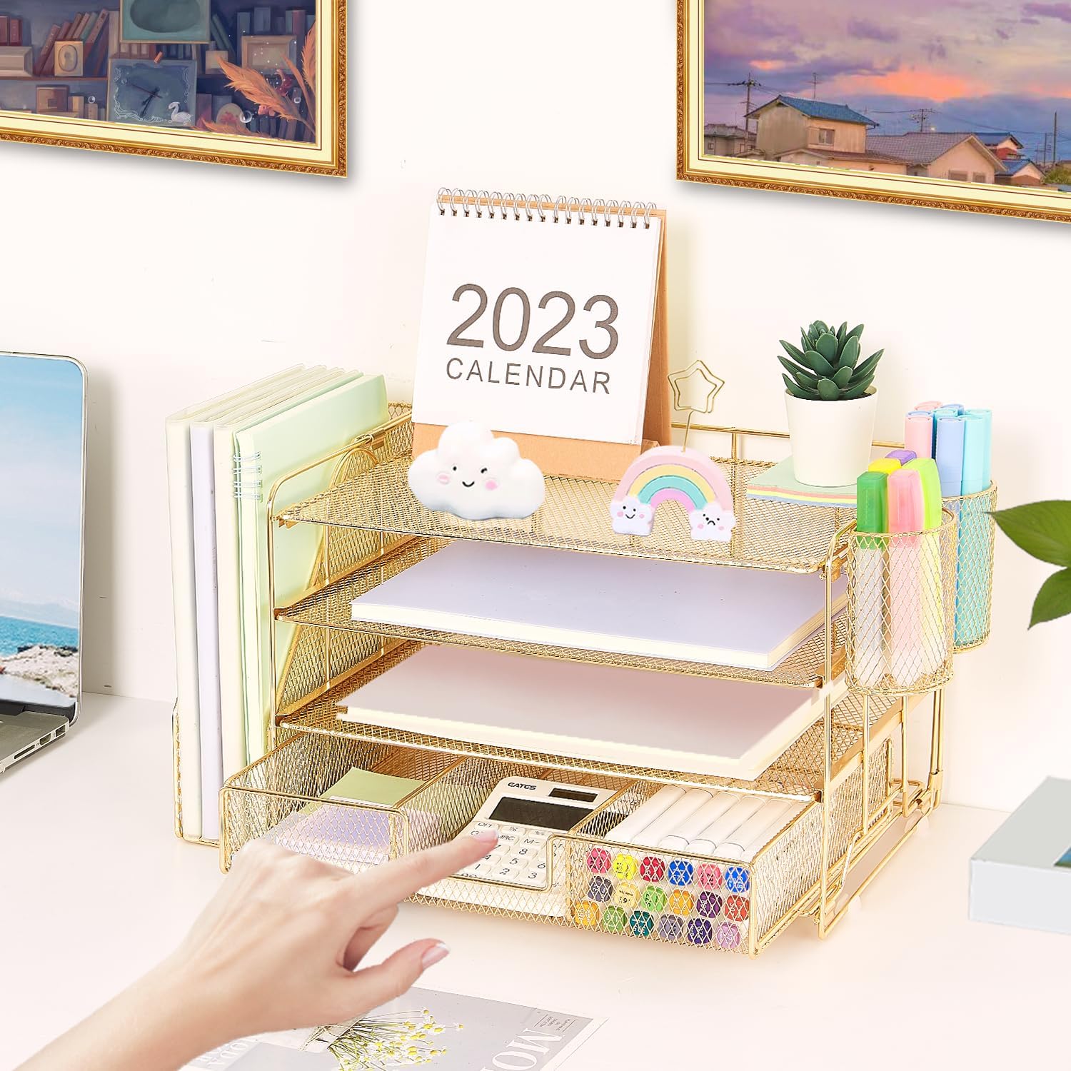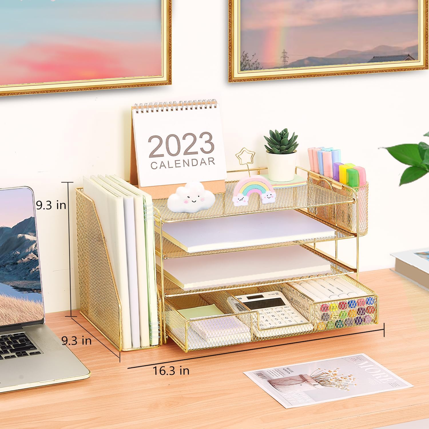 Desk Organizer and Accessories, 4-Tier Desktop File Organizer with Drawer and 2 Pen Holders, Office Desk Accessories for Office Supplies(Gold)