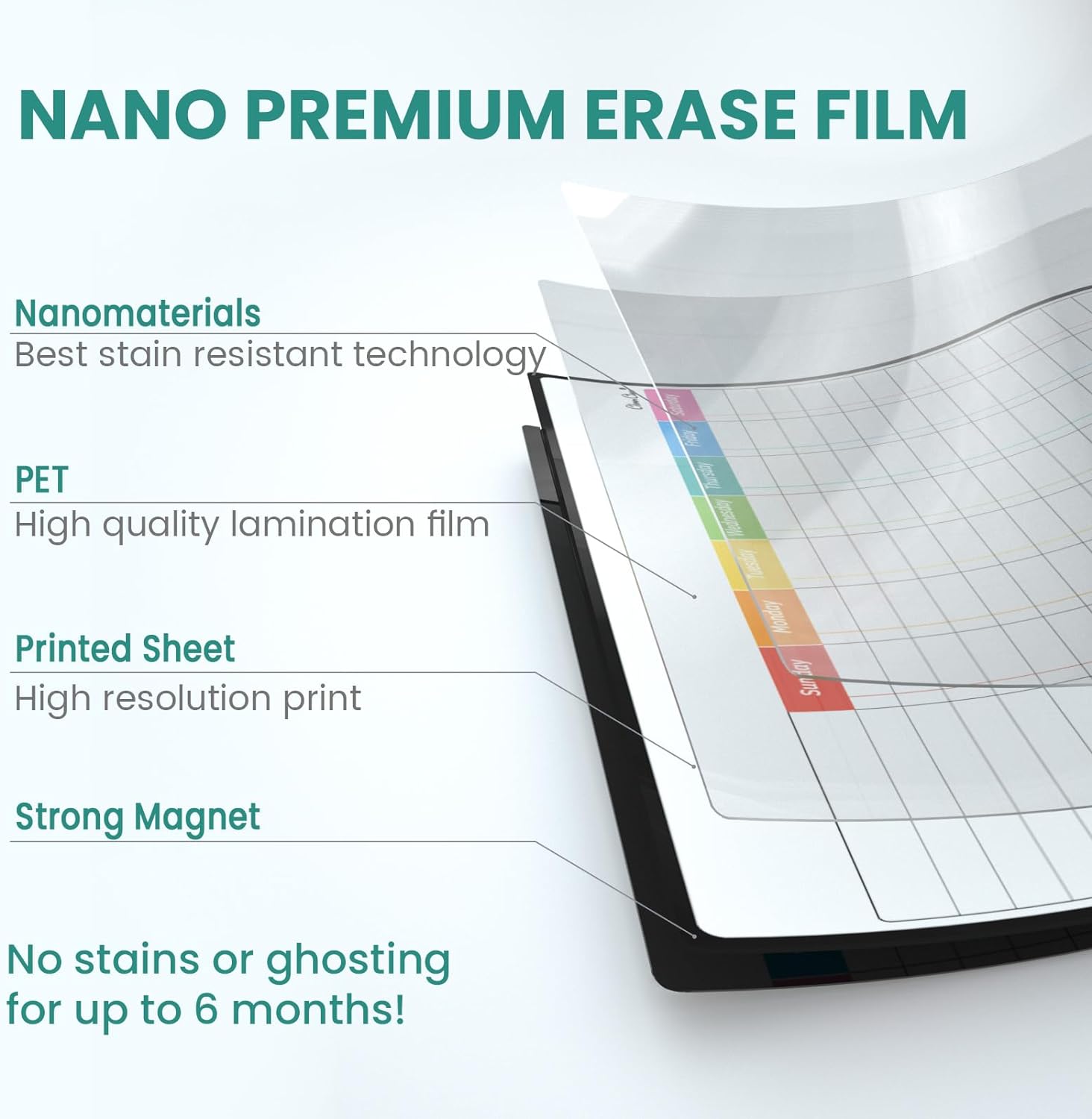- Erases easily - Our calendars use premium nano erase film, making it incredibly easy to wipe off notes, even those that have been written for a long time. No residue, no fuss.