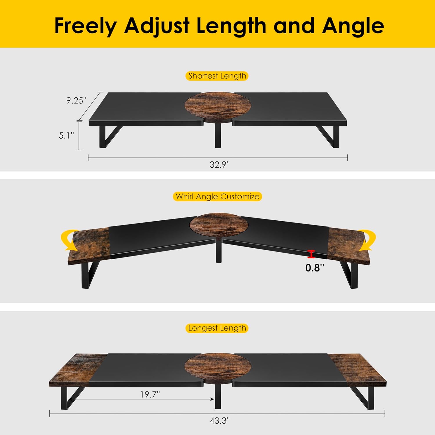 - Adjustable Length & Angle:You could adjust the length of large computer stand for desktop monitor from 32 to 55 inch, which could be adjustable to accommodate 1-2 monitors/laptops to meet your office needs. Wiht the circular turntable in the middle, you could move monitor riser for 2 monitors at any angle to customize a comfortable position.