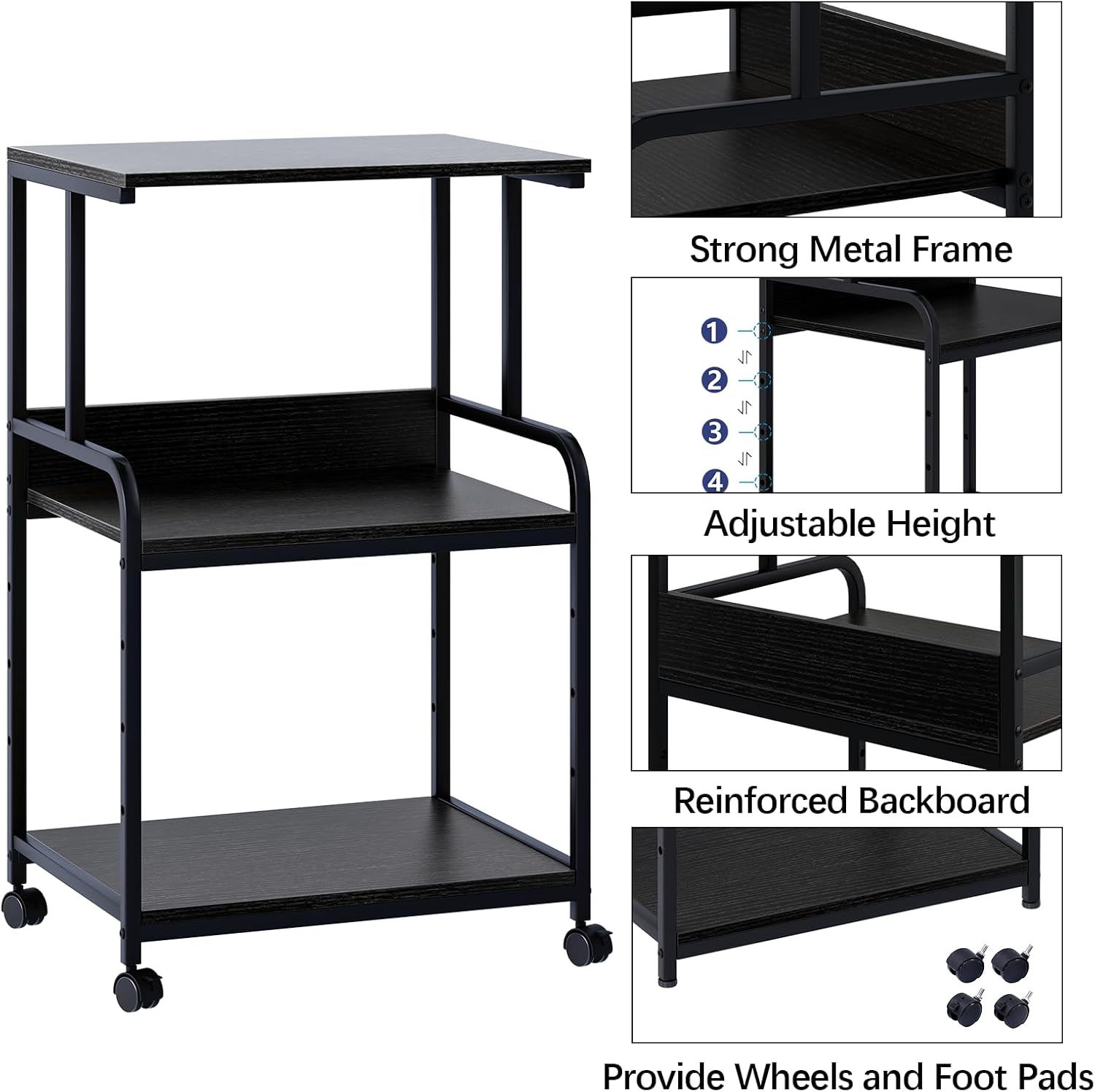 Printer Stand with Storage Shelf,3 Tier Printer Cart with Wheels,Mobile Printer Table for Home Office,Stands for Heat Press Scanner Fax,Industrial Style (Black)
