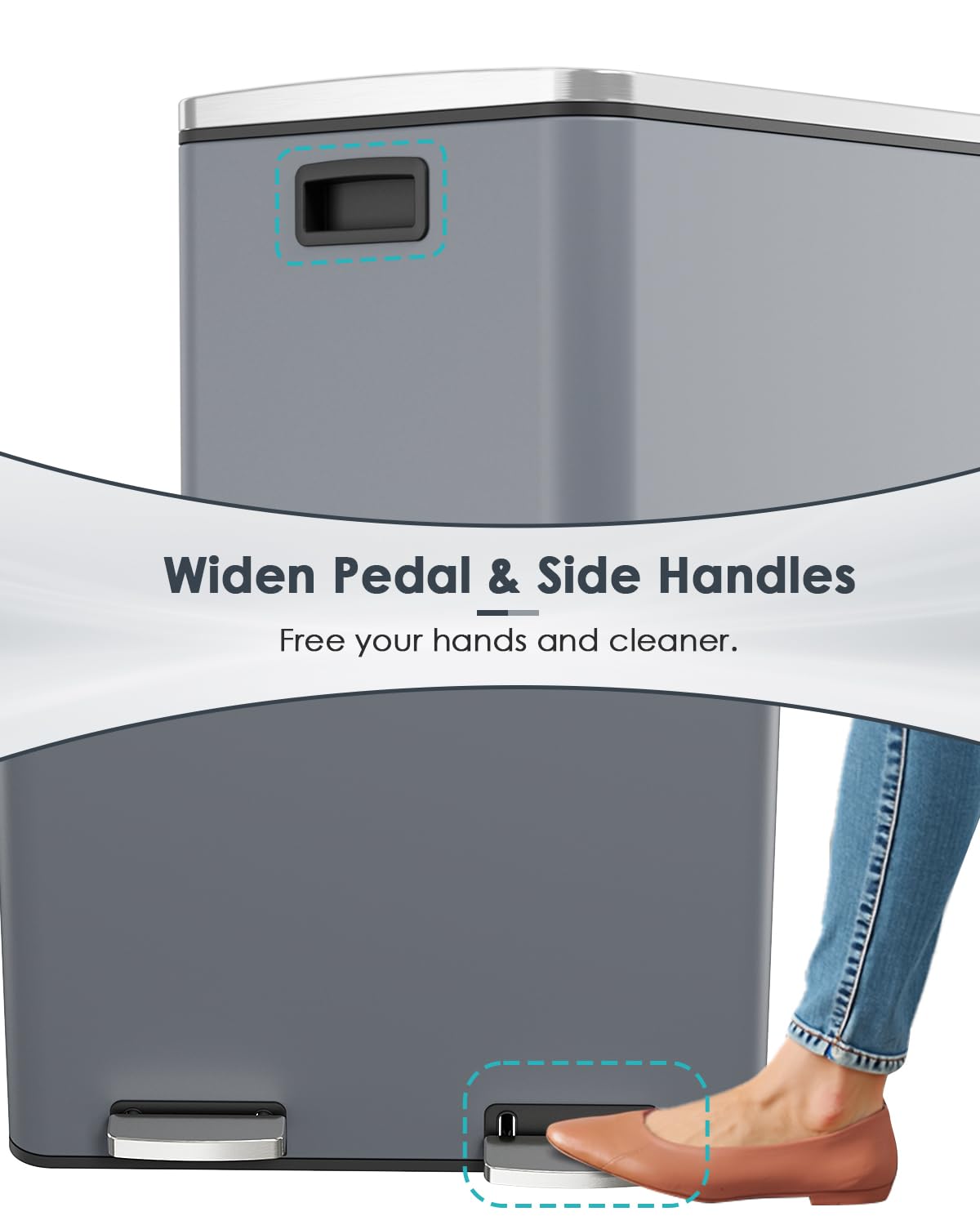 - THICK & WIDE PEDEL: Wide and thick stainless steel pedal is ergonomically designed, so you can throw out trash without bending over, and you don't need to touch the lid of the bucket when throwing out trash.