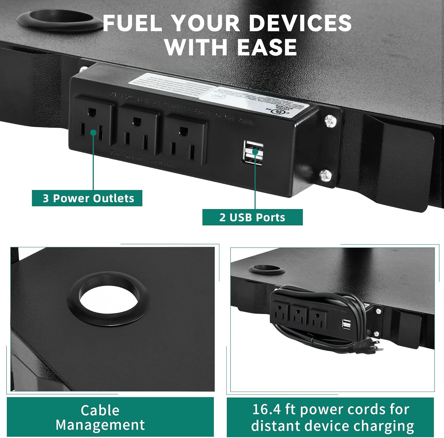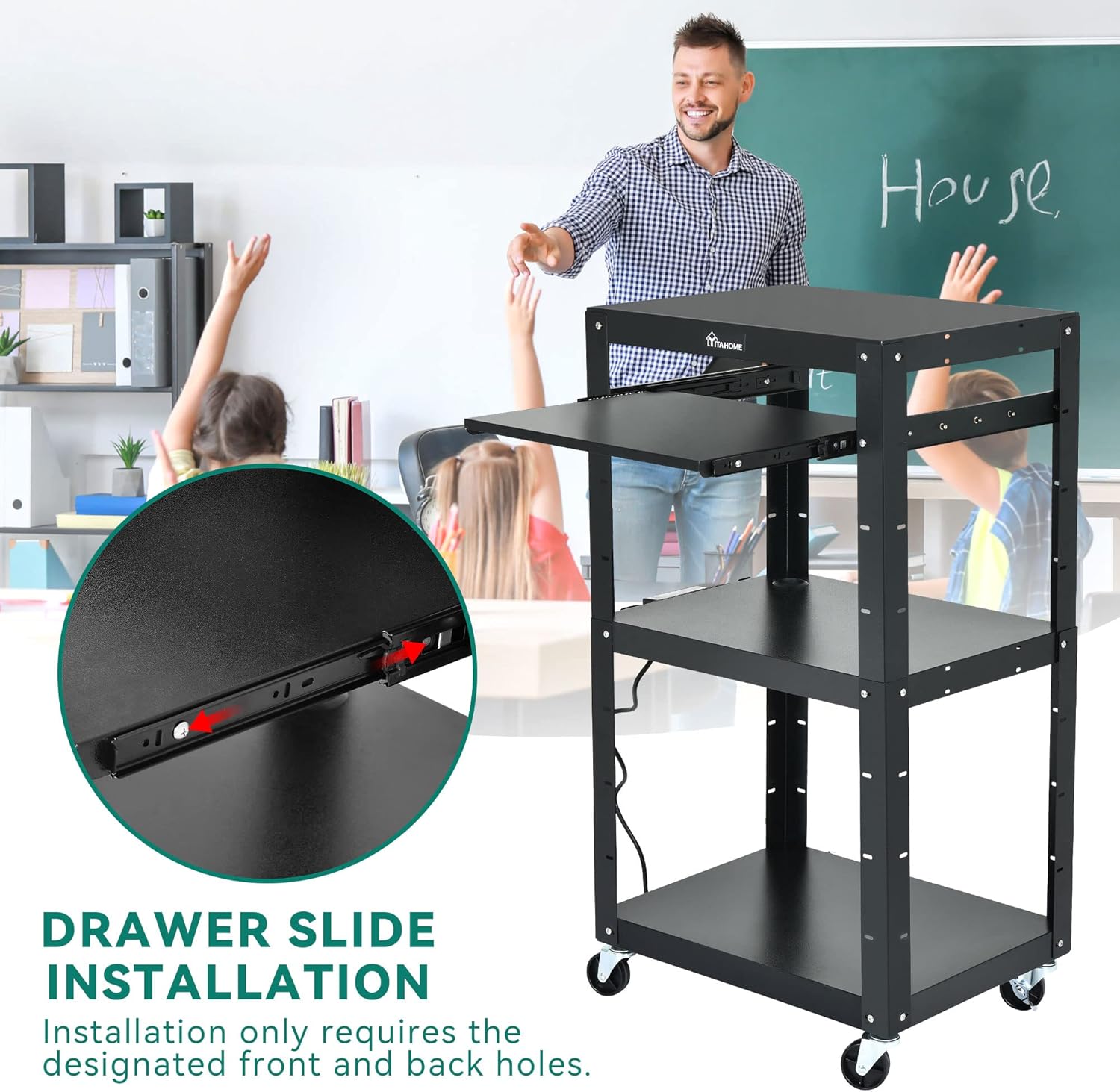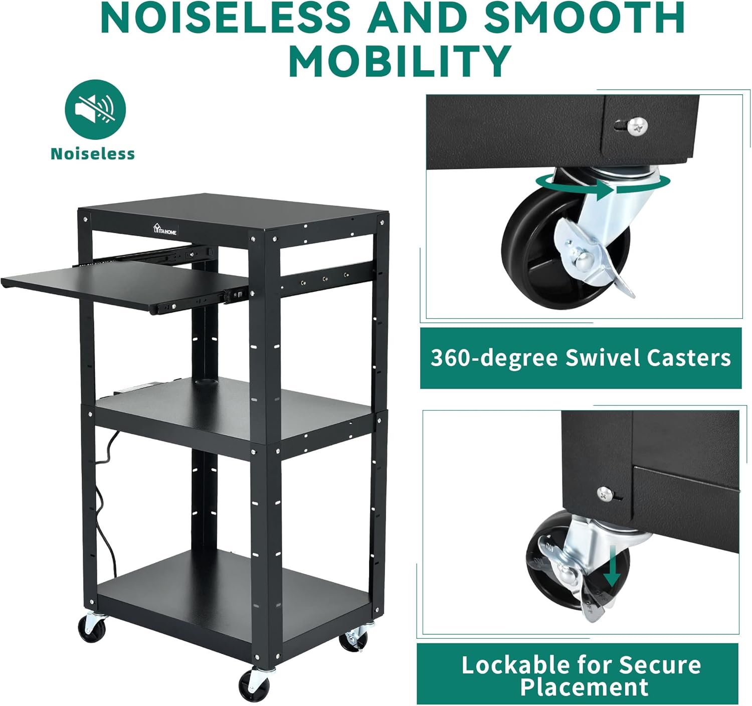 - Long-range use: This business-grade AV cart is equipped with a built-in power strip with 3 outlets and 2 USB ports, a 16.4-ft power cord to charge devices over long distances.