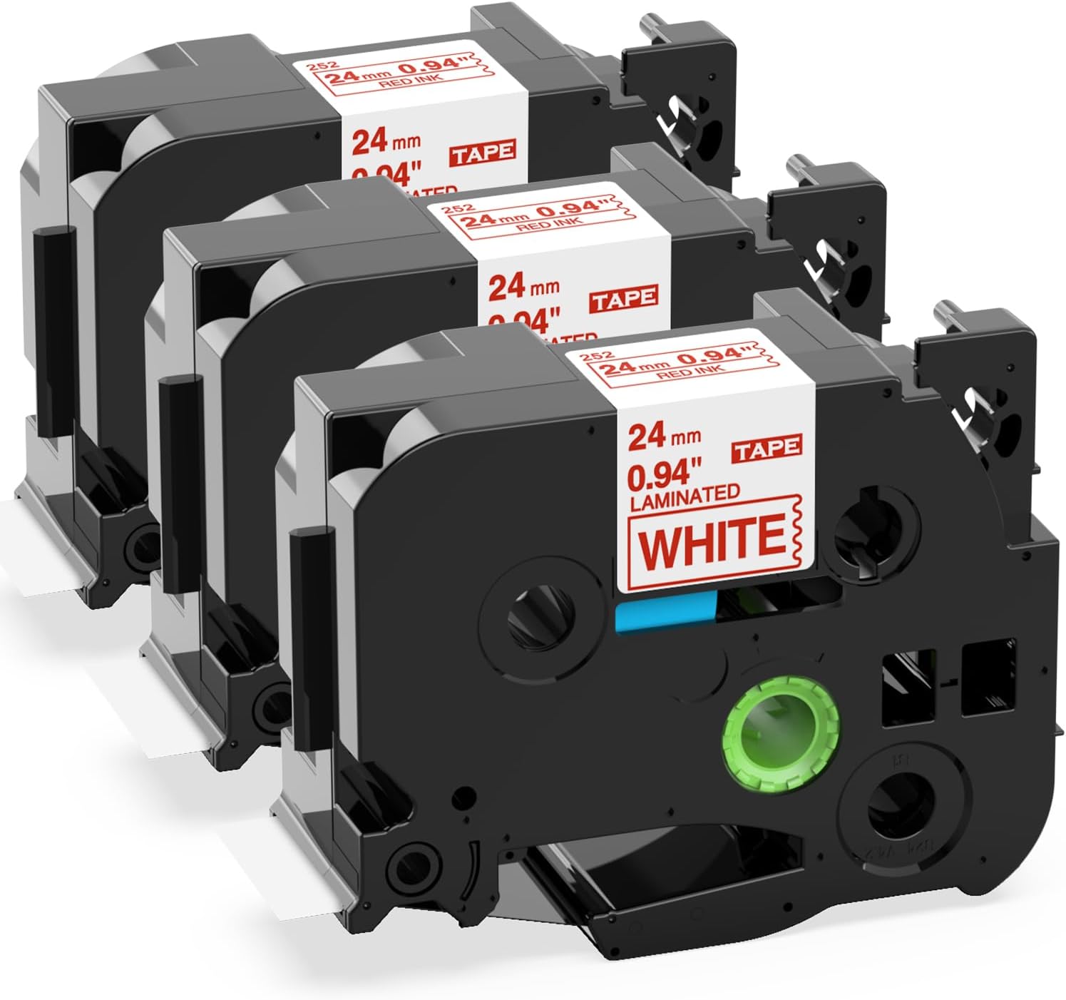 - 3-Pack compatible with brother p touch red on white tape TZe-252 TZe252 24mm tze tape. Color: Red on White. Width: 24mm (1") Length: 8m (26.2ft)