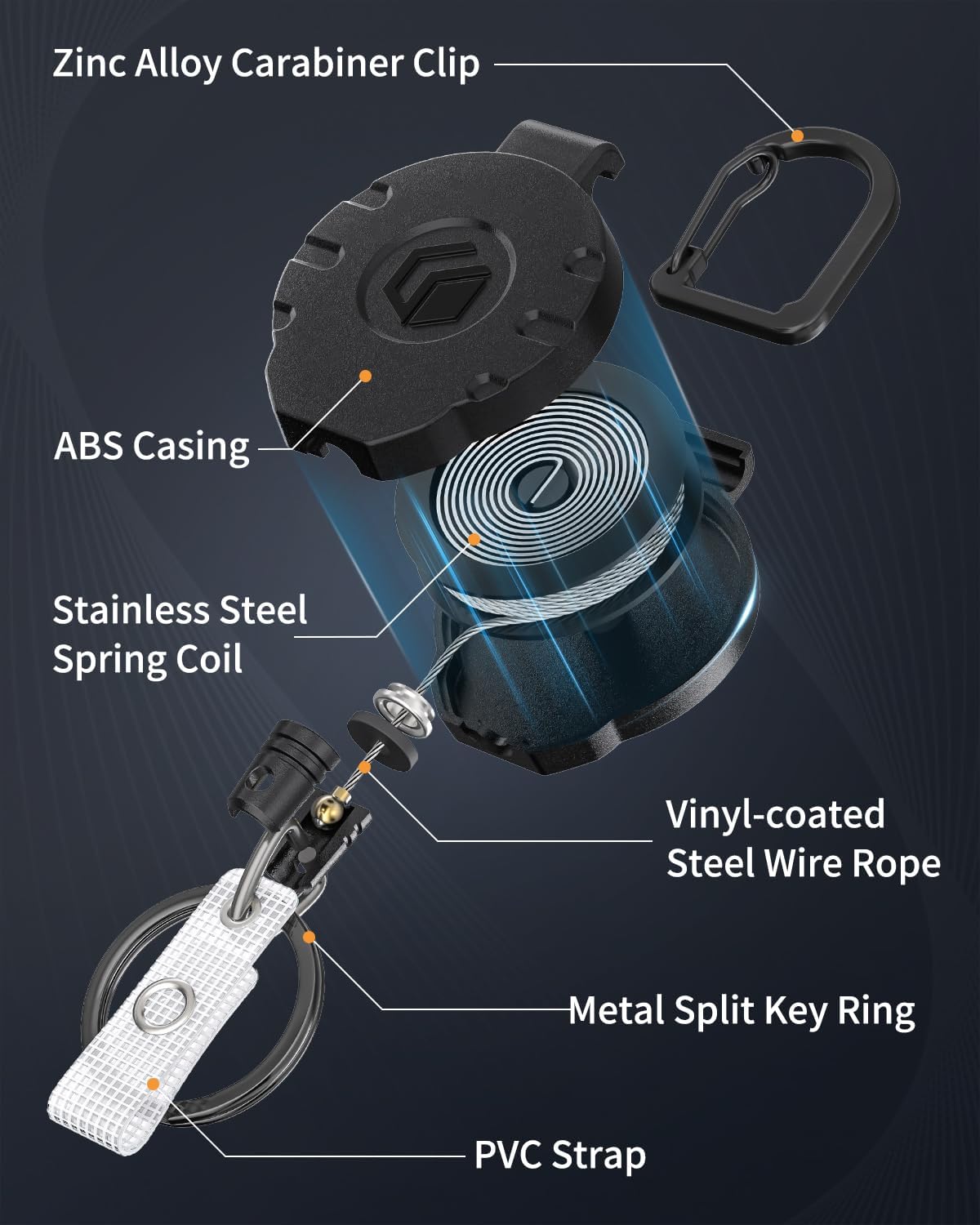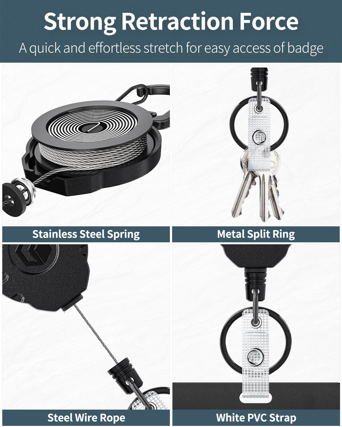 - Retractable Keychain: With built-in stainless steel spring coils, it has strong retraction force to endure pulls over 10,000 times and hold up to 8 oz. The 1 mm steel wire rope can stretch up to 31.5". Easy to open the door without removing the badge or key.