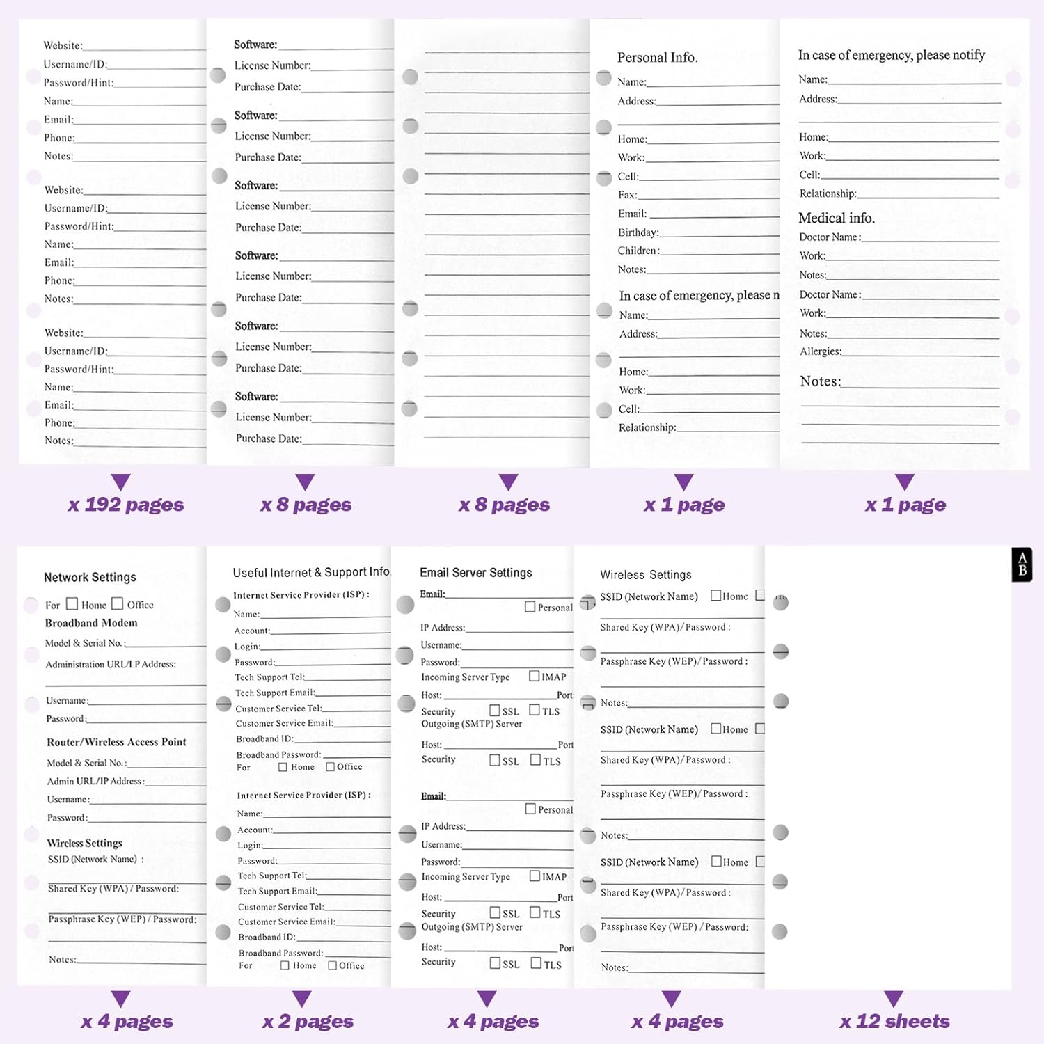 - Lockable Password Keeper Book: Our refiilable password login book has 316 pages and 12 double-sided laminated dividers with alphabetical tabs, providing up to 576 entires of website, username/ID, password/hint, name, email, phone, notes, 48 software license data, settings of 8 emails' settings, 12 wireless and 4 network, 2 support pages, 1 emergency info & medical contact etc. This password notebook provides huge space to store all your internet data & login details in one place.