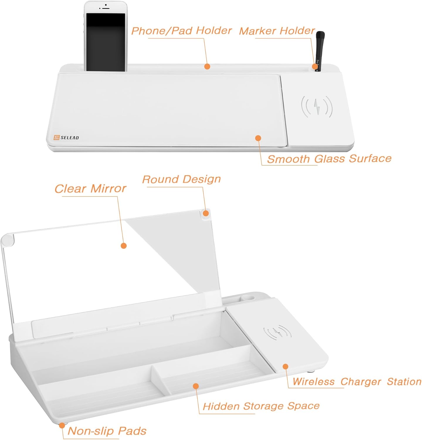 SELEAD Desktop Glass Whiteboard with Wireless Charger Station & Built-in Mirror, Dry Erase Board Computer Pad Keyboard Stand with Organizer for Home, School, Office Desk Accessories, White