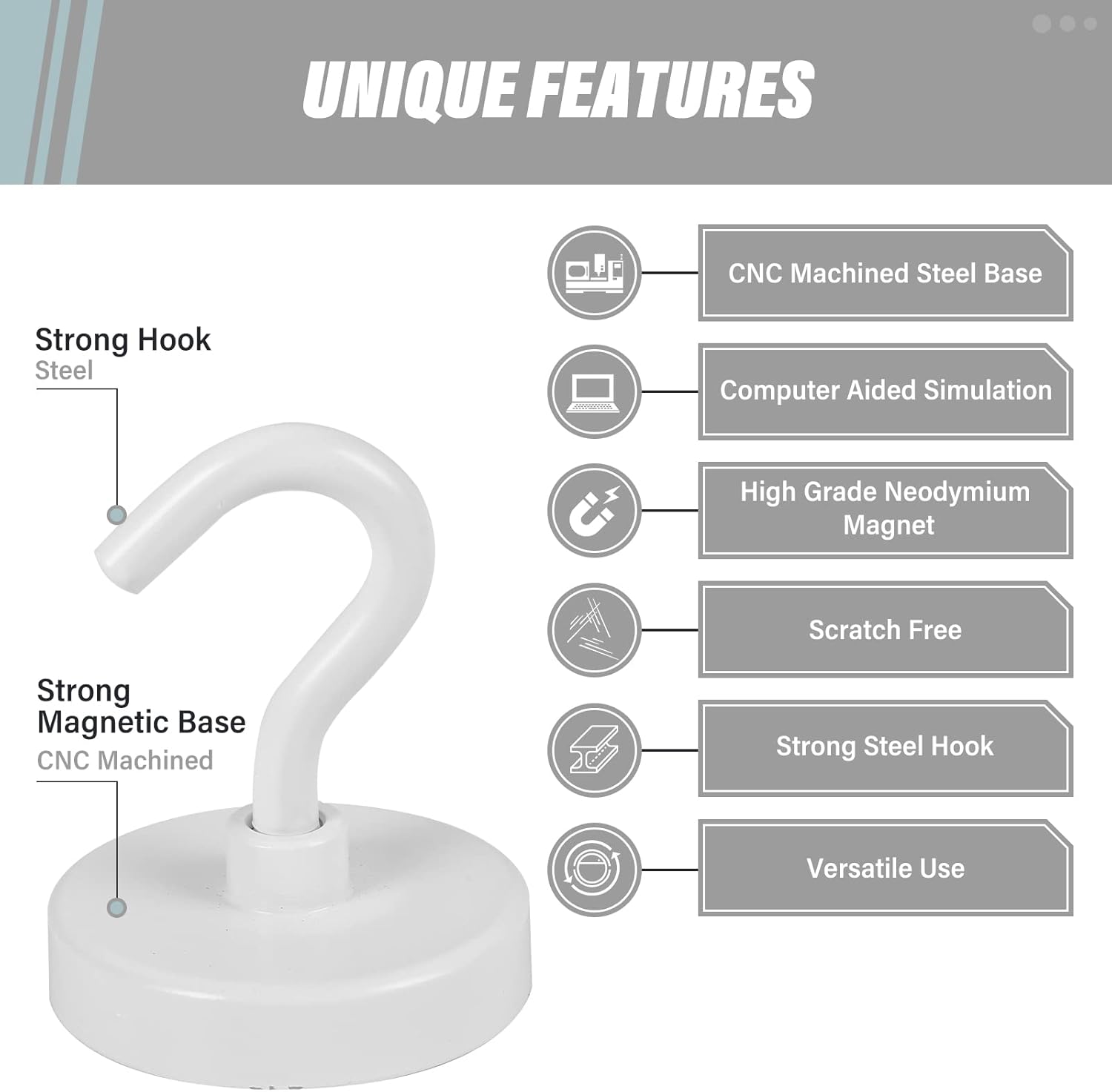 Neosmuk Magnetic Hooks Heavy Duty, Strong Magnet with Hook for Fridge, Super Neodymium Extra Strength Industrial Hooks for Hanging, Magnetic Hanger for Toolbox, Cruise, Grill(White,4 Pack)