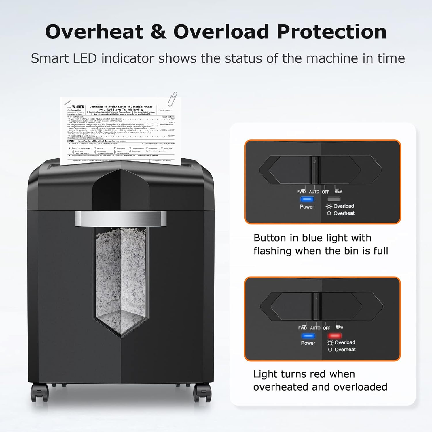 - 【Jam-Proof System】Shredders for home office has overload protection functions protect you from paper jams, after pressing the power switch, just need to put the paper into the shredder inlet, this office shredder will work automatically.
