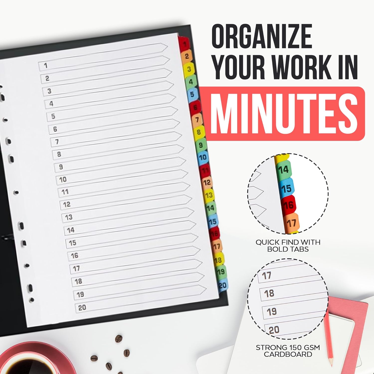 - REINFORCED 1-20 NUMBER TABS - The 1 to 20 tabs are all reinforced for extra strength