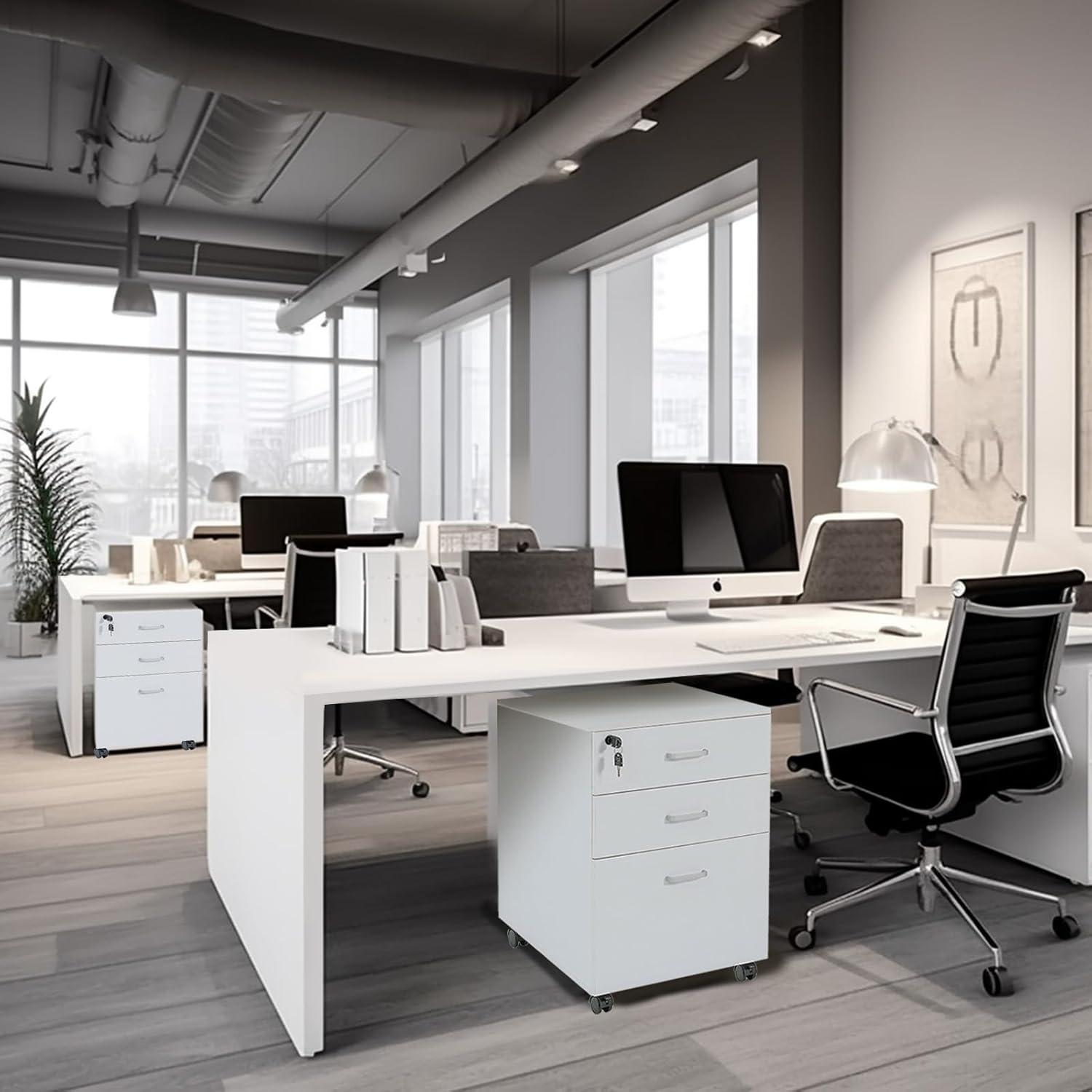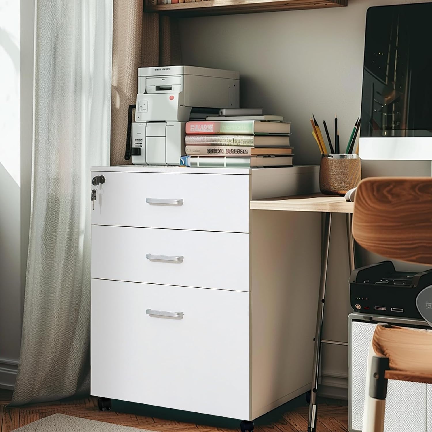 QDSSDECO 3 Drawer Mobile File Cabinet, Rolling Vertical Filing Cabinet fits A4, Legal Paper and Letter Paper for Home Office, White with Lock