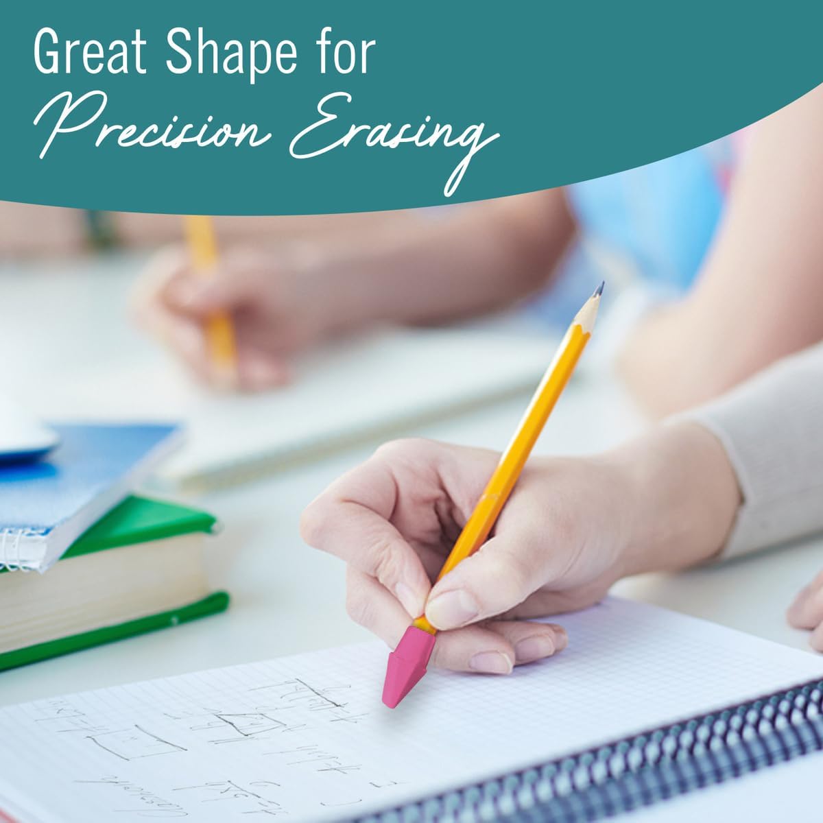 - Wedge shaped pencil toppers with sharp corners are great for precise erasing and large area erasing.
