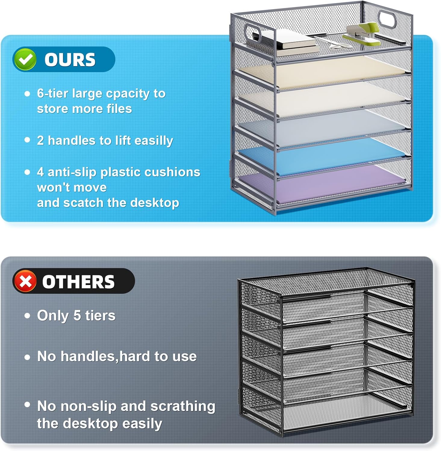 Marbrasse 6 Tier Paper Organizer Letter Tray - Mesh Desk File Organizer with Handle, Paper Sorter for Letter/A4 Office File Folder Holder - Grey