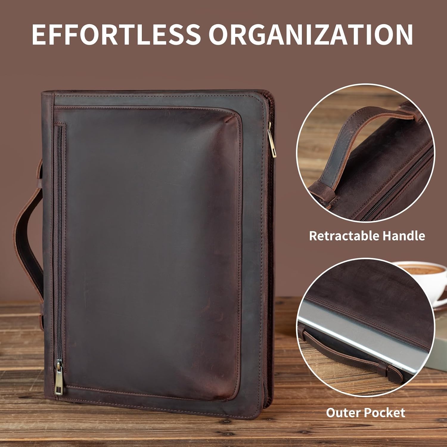 - GIVE THE PROFESSIONAL FIRST EXPRESSION –100% Full Grain Crazy-horse Leather, Our quality leather feels soft and luxurious while protecting all your important documents.Features portable handle for easy travel,Sturdy and smooth zipper, to ensure the safety of items; outside zippered pocket for quick-access,can hold A5-size documents; plenty of storage room and pockets to hold your phone, iPad, documents and other accessories.