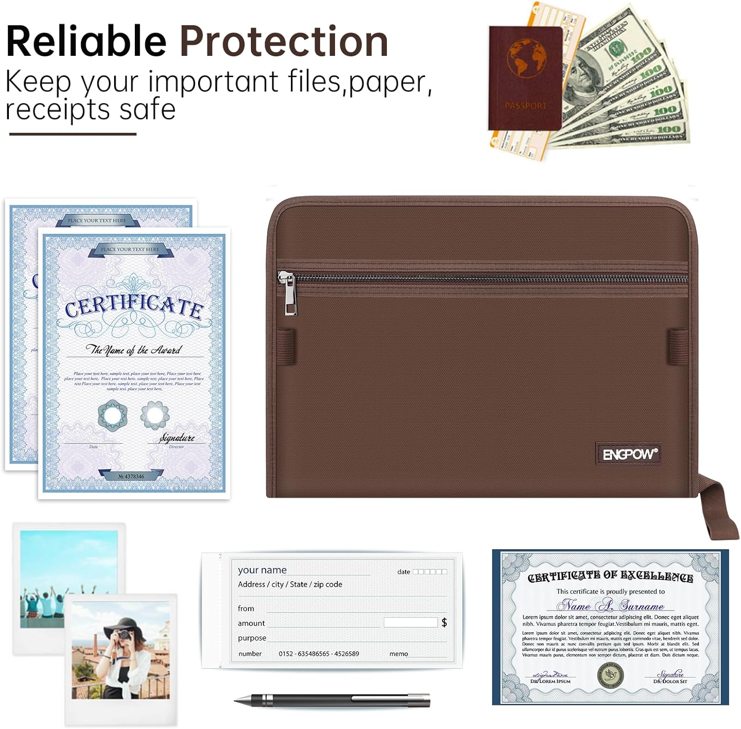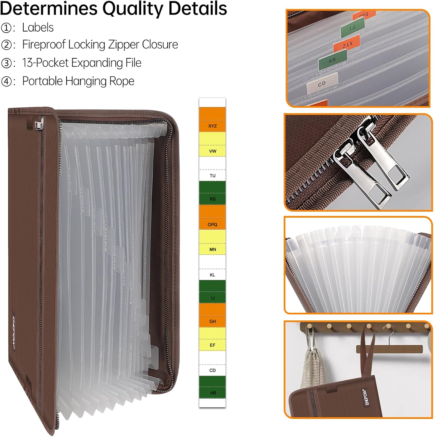 ENGPOW Accordion File Organizer,Fireproof 13 Pockets Expanding File Folder,Document Organizer Folder with Zipper&Labels,Portable Home Travel Safe Storage for Letter A4 Files and More,Brown
