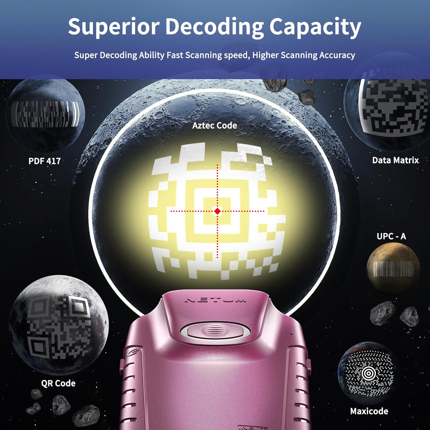 - Superior Scanning Performance - The NETUM E900 bluetooth barcode scanner has Equipped with Newland's Megapixel CMOS sensor 1280H × 800V pixels (1M) which can easily capture most of the 1D / 2D barcodes on labels or displayed on screens., Resolution ≥3mil, such as ISBN/UPC/EAN,UPC/EAN With Supplementals, Code39, Interleaved 2 of 5, Code 128, Codabar,QR, Data Matrix,DotCode, GS1 Databar (RSS) etc.