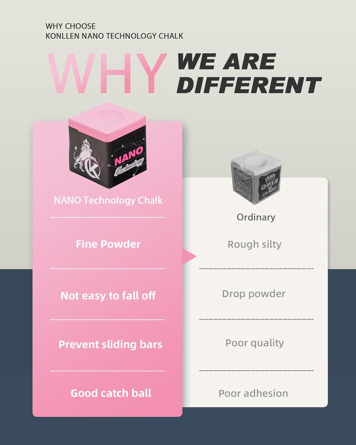 - Nano Technology: KONLLEN pool hand chalk utilizes revolutionary nano-materials, ensuring an ultra-fine texture with superior adhesion. It resists flaking and spreading, making it more environmentally friendly and healthier. With KONLLEN, you can achieve the best feel and performance in any condition.