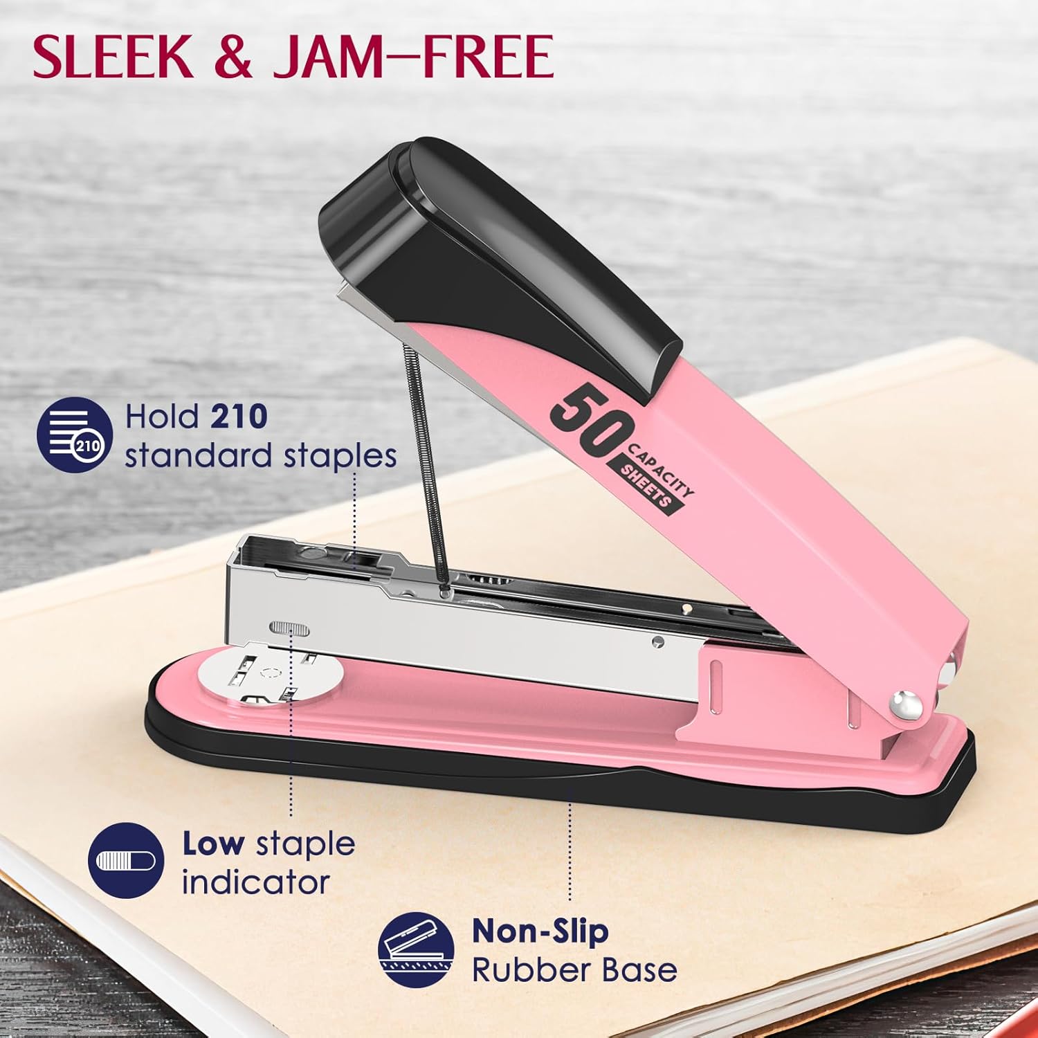 - 【Staplers for Desk】: Our stapler can hold a full strip of 210 standard staples. Non-slip rubber base keeps stapler securely in place while using. The low-staple indicator helps you know the time to refill.