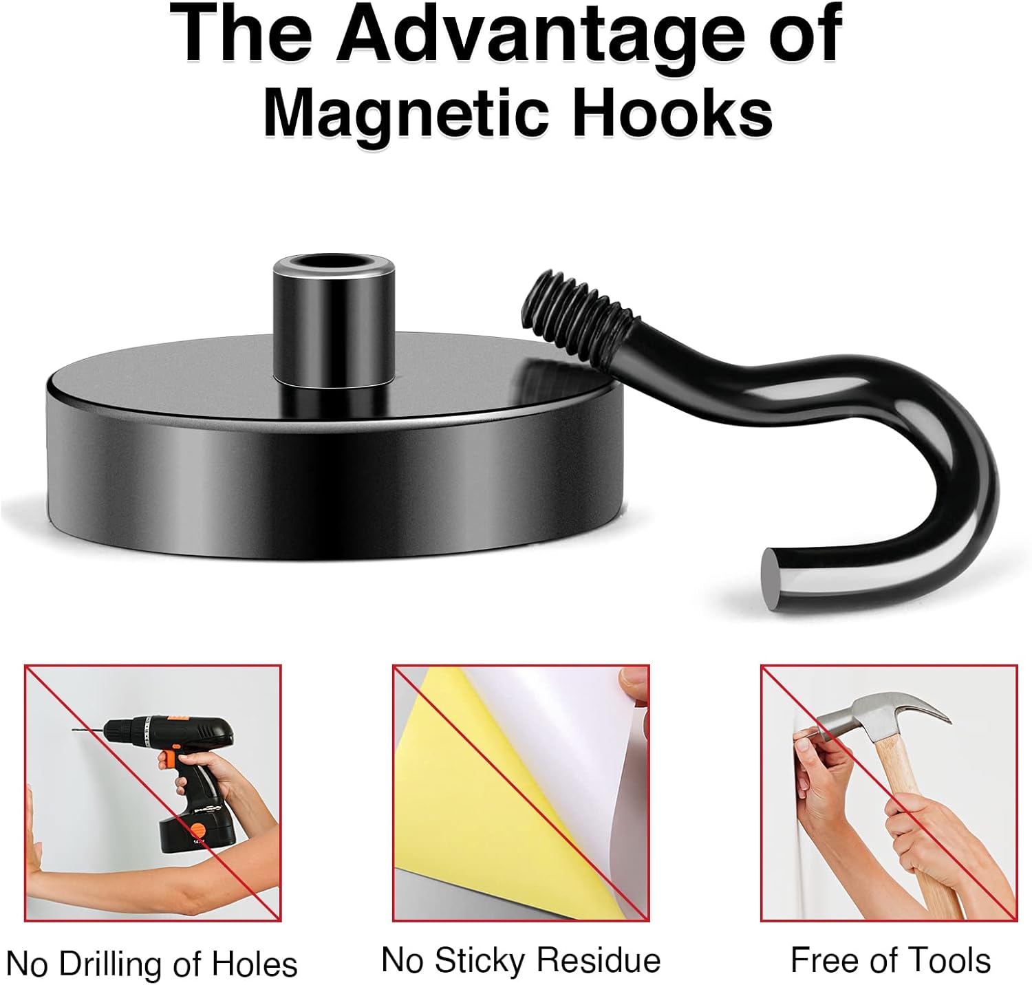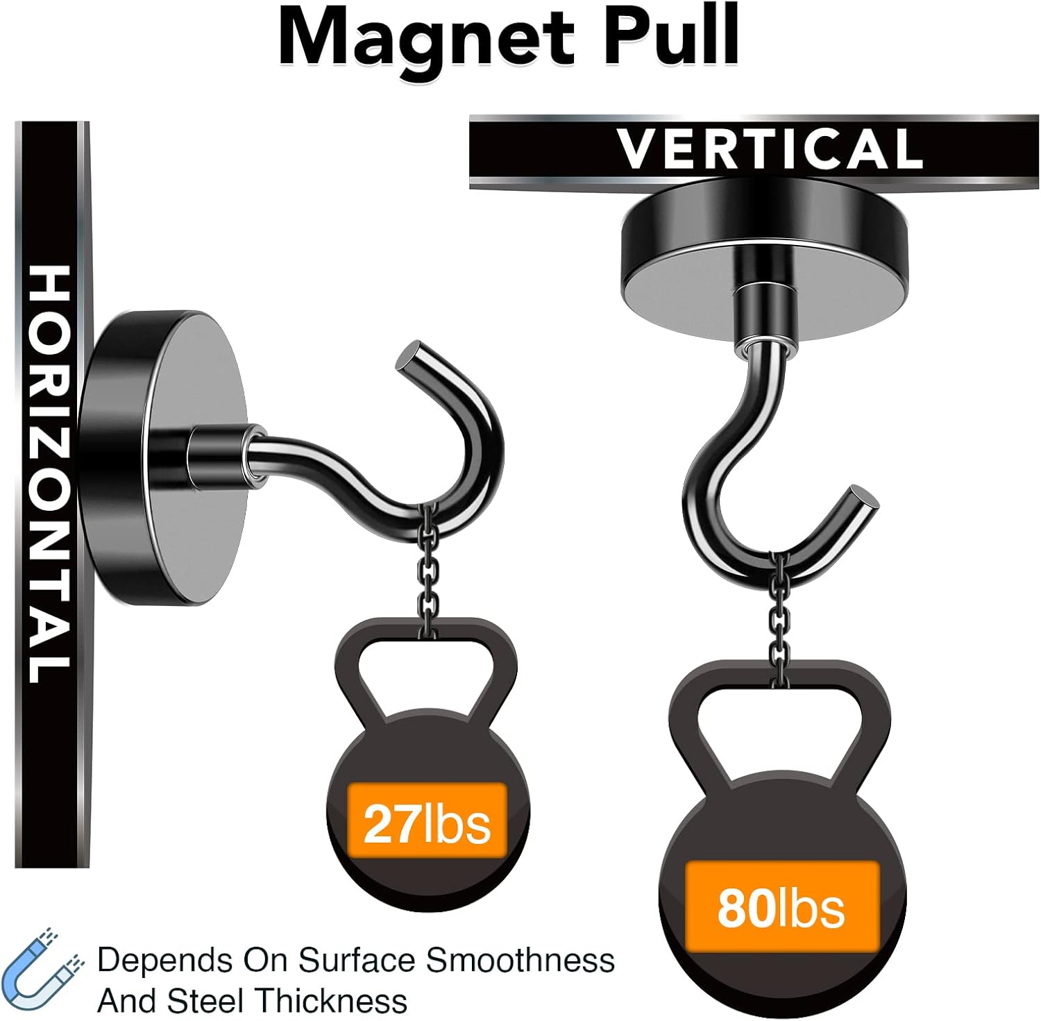 - 【Extra Magnet Hooks】- Get extra strong hold with our neodymium magnetic hooks! With over 80lbs of attractive force on horizontal surfaces, these magnetic hooks can securely hang heavy items. Even on vertical surfaces, the power of the magnets is still impressive, reducing by only 2/3. These sturdy and reliable hooks with strong magnets are the perfect solution for all your heavy-duty hanging needs