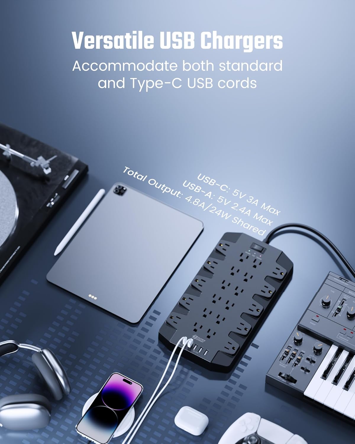- 【Smart USB-C Fast Charging】 Not need to find adapters or plugs for your iPhone, iPad or other USB devices, this power strip is a nice upgrade as there are 2 UBS-C & 4 USB-A charging ports. The built-in smart charging technology allows the USB C chargers to detect your devices automatically and deliver the fastest possible charge up to 5V/3A