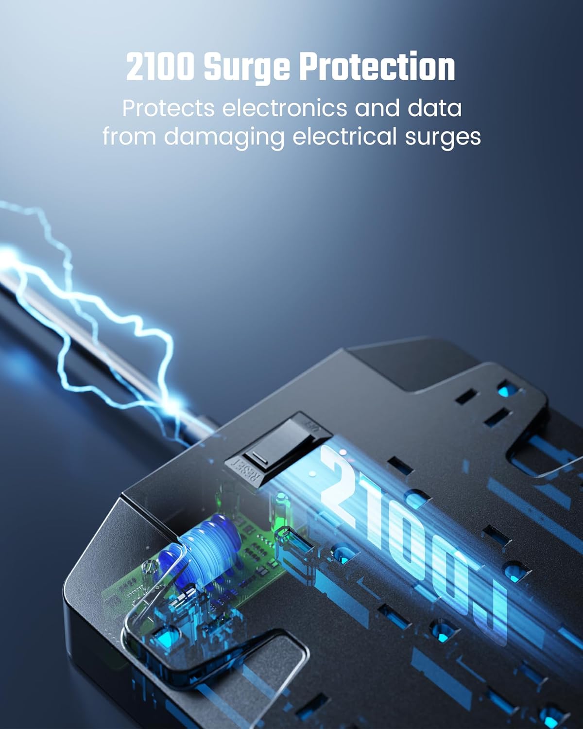 - 【8 Safety Protections】2100J surge protection, overload protection (15A), over-current protection, short-circuit protection, over-voltage protection, overheat protection, grounded protection, and flame-retardant (rated UL94 V-0, the highest level of fire resistance for casing materials). The power strip is fully compliant with FCC and RoHS safety standards, and is reinforced with a UL-Recognized extension cord and flat plug (1875W/15A)