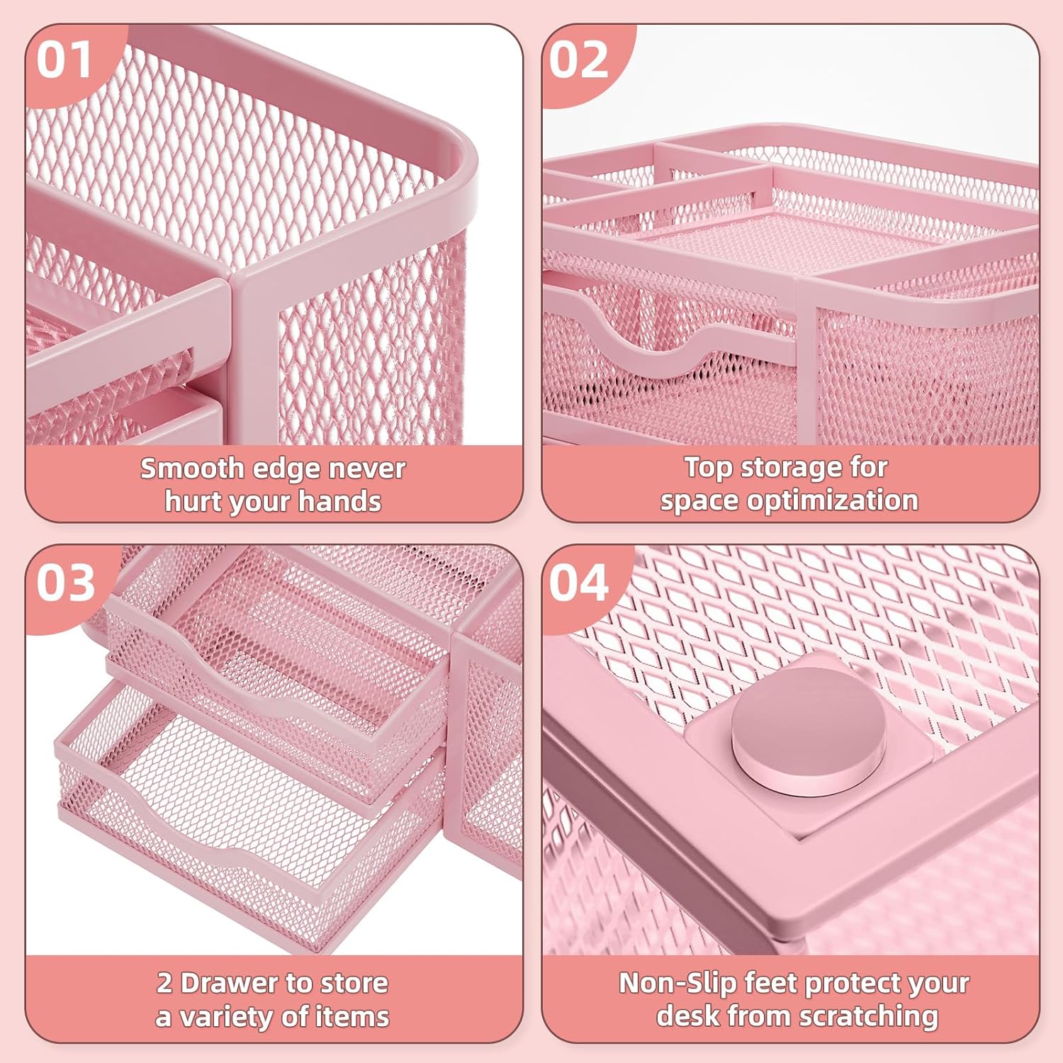 Marbrasse Mesh Desk Organizer, Pen Organizer with 2 Drawer, Multi-Functional Pencil Holder, Desk Organizers and Accessories with 5 Compartments + Drawer for Office Art Supplies (Pink)