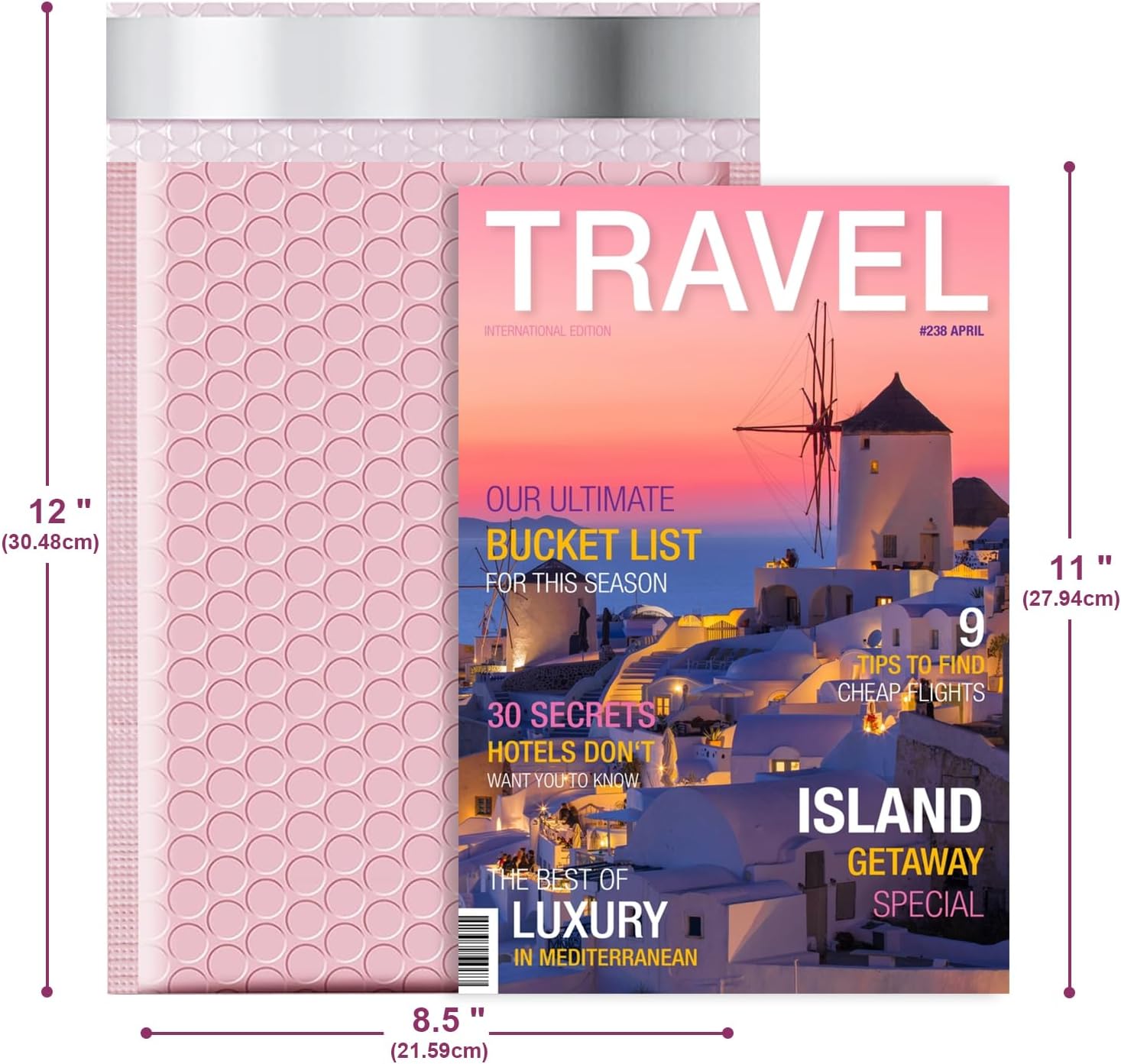 - Compact Private Bubble Mailers-- Usable Space: 8.5x11, Outer Size: 8.5x12 | Pack of 25 | Color: Pink. Lightweight polyethylene bubble envelopes cut transportation costs and enhance packaging allure with fashionable colors. Crafted from premium polyethylene, these poly mailers offer absolute privacy protection.