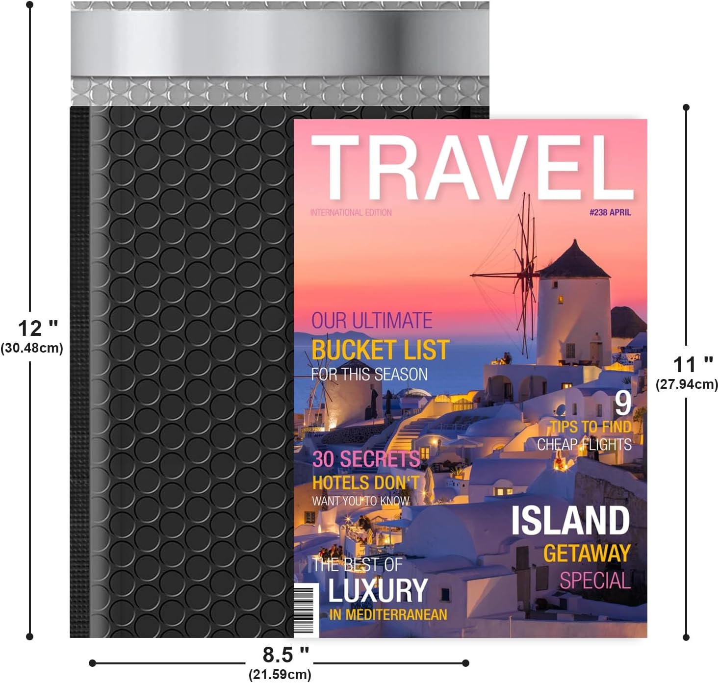 - Compact Private Bubble Mailers-- Usable Space: 8.5x11, Outer Size: 8.5x12 | Pack of 25 | Color: Black. Lightweight polyethylene bubble envelopes cut transportation costs and enhance packaging allure with fashionable colors. Crafted from premium polyethylene, these poly mailers offer absolute privacy protection.