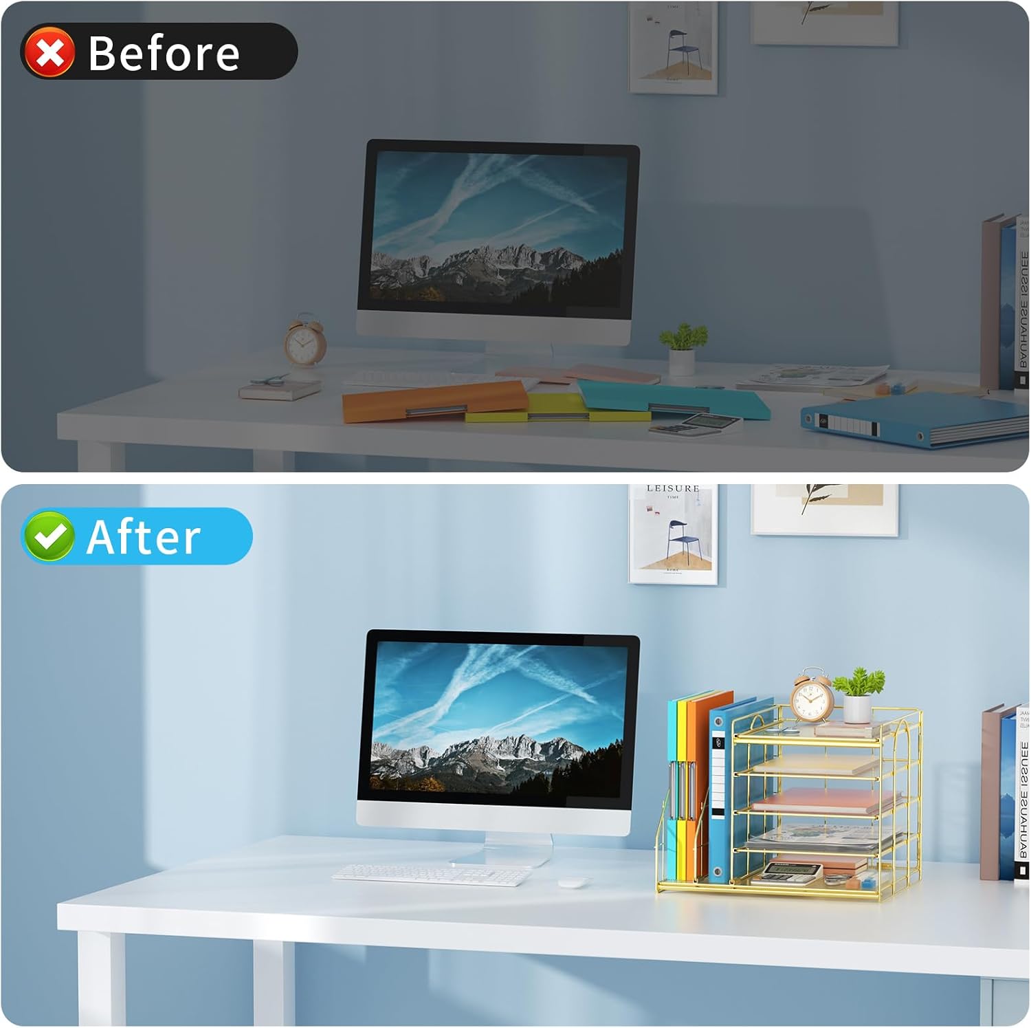 - 【Space Saving】All office document folders would be organized by the vertical file holder. The paper tray organizer is very suitable for storing books, magazines, letters, and A4 paper. The desk organizer enough accommodate all office supply accessories, such as pens, pencils, scissors, and so on. Perfect Size: 13.8*11*12inch