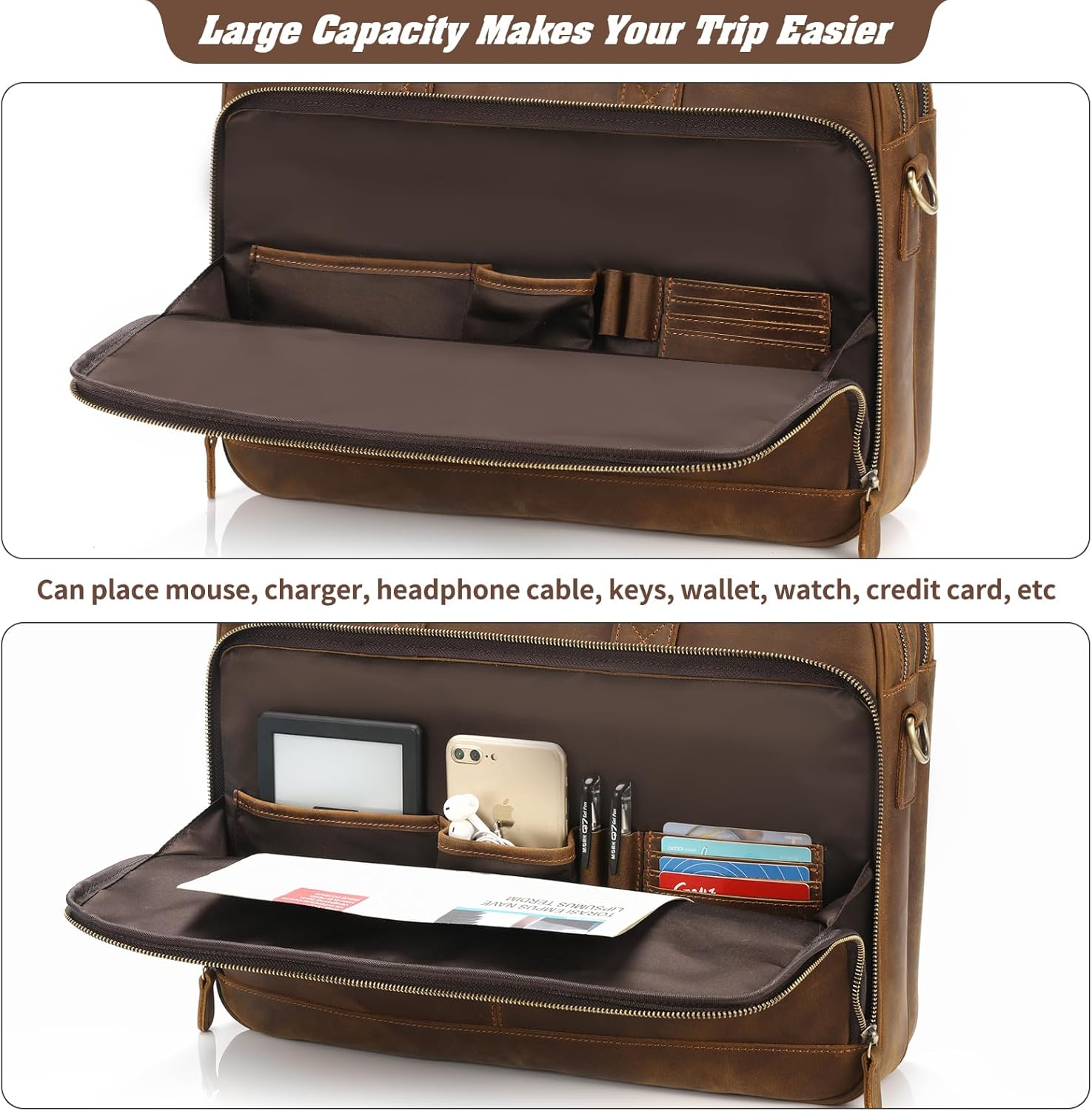 - Structure for this brown leather messenger bags for mens: 1* main pocket, 1* front zippee handle of your pocket (a multi-functional storage area for A4 papers, pens, cards, key, phone, ect.), 1* inner zipper pocket, 1* 15.6 inch padded laptop compartment. Also with a belt backside attach to travel luggage,free your hands,very convenient.