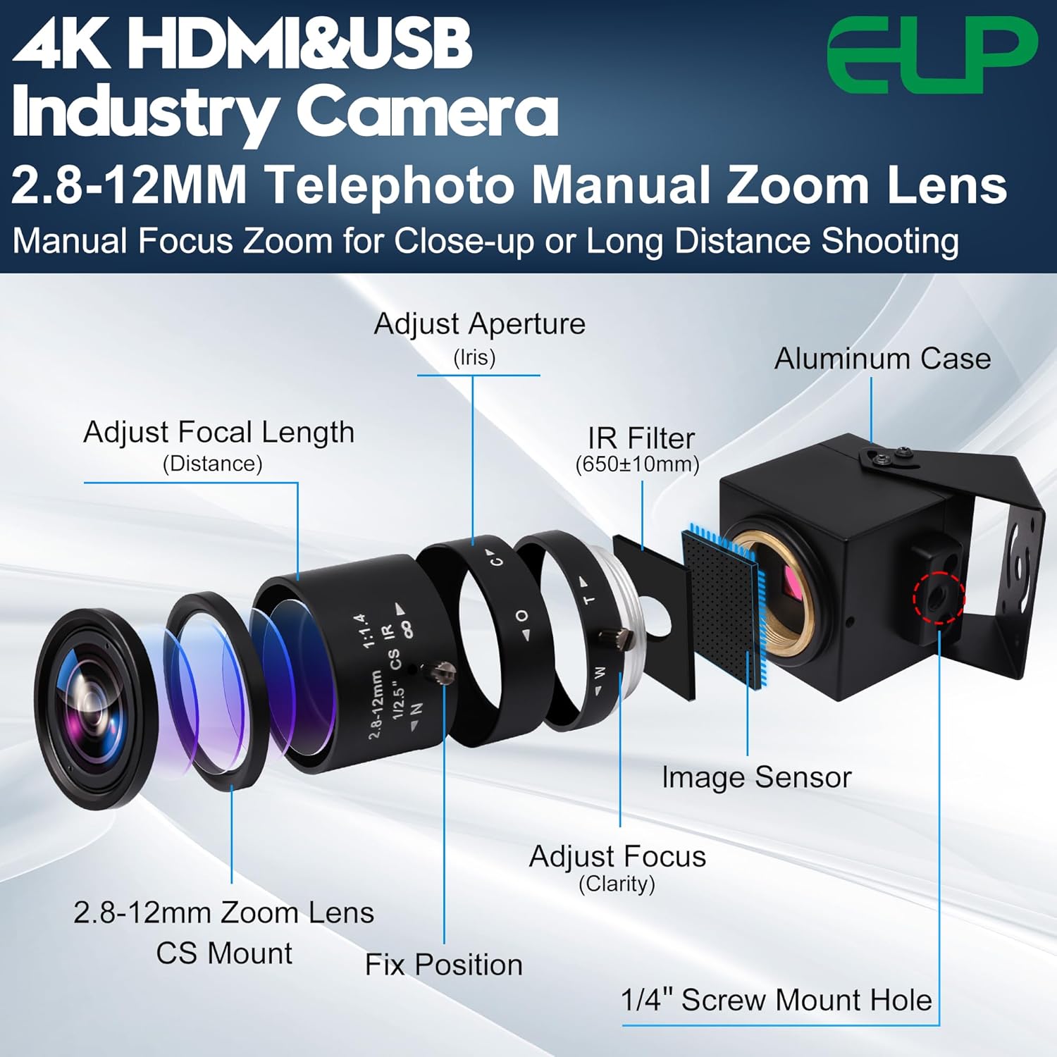 ELP 4K USB HDMI Camera Manual Zoom Webcam - Variable Focus H.264 Telescope USB Security Mini Close-up for Computer - 8mp IMX415 Industrial CCTV (2.8-12mm 4X Zoom Lens)