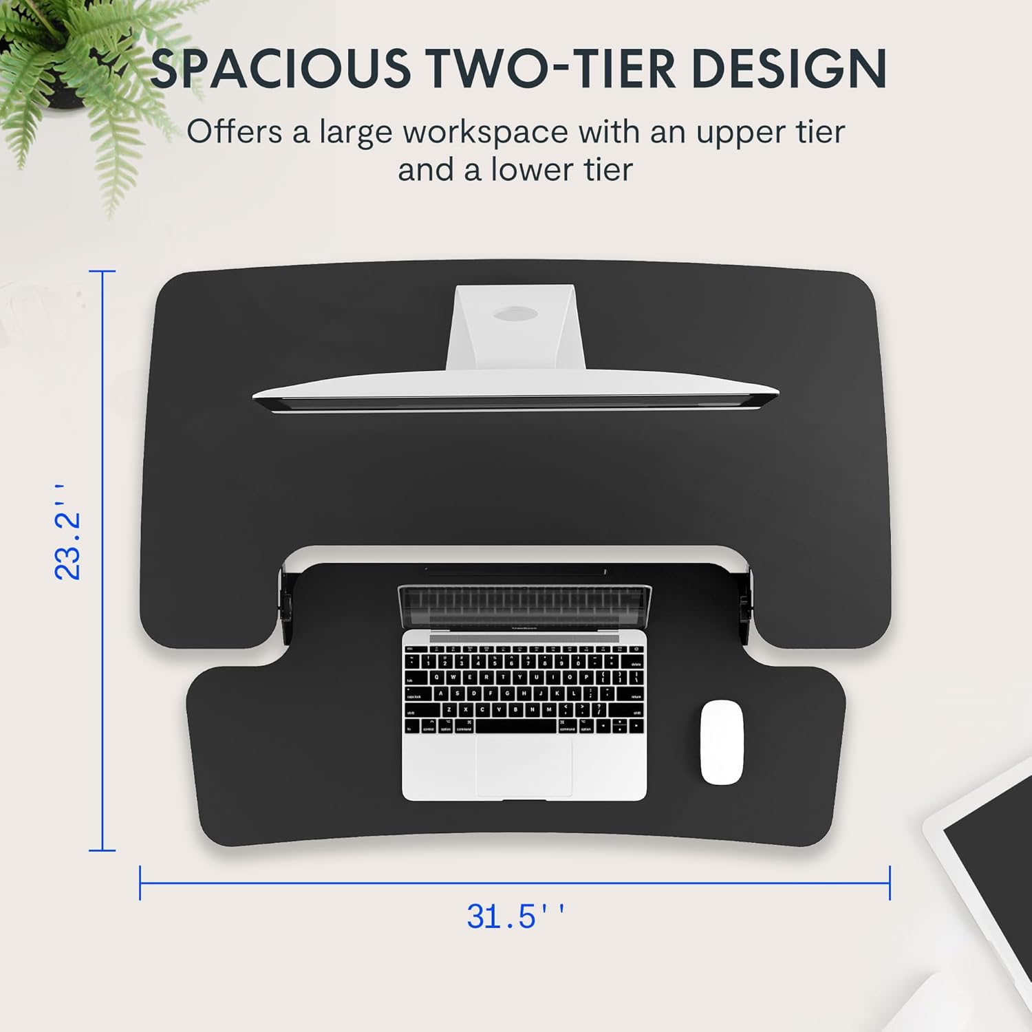 - Double Layer Office Space: This adjustable standing desk converter with a wide desktop is super space-saving and has enough space for all of your gadgets, it can hold a computer monitor, paperwork, and tablet, phone, notebook, coffee, and so much more! An oversized keyboard tray that accommodates flexible setup options like a 17-inch laptop or a keyboard and mouse.