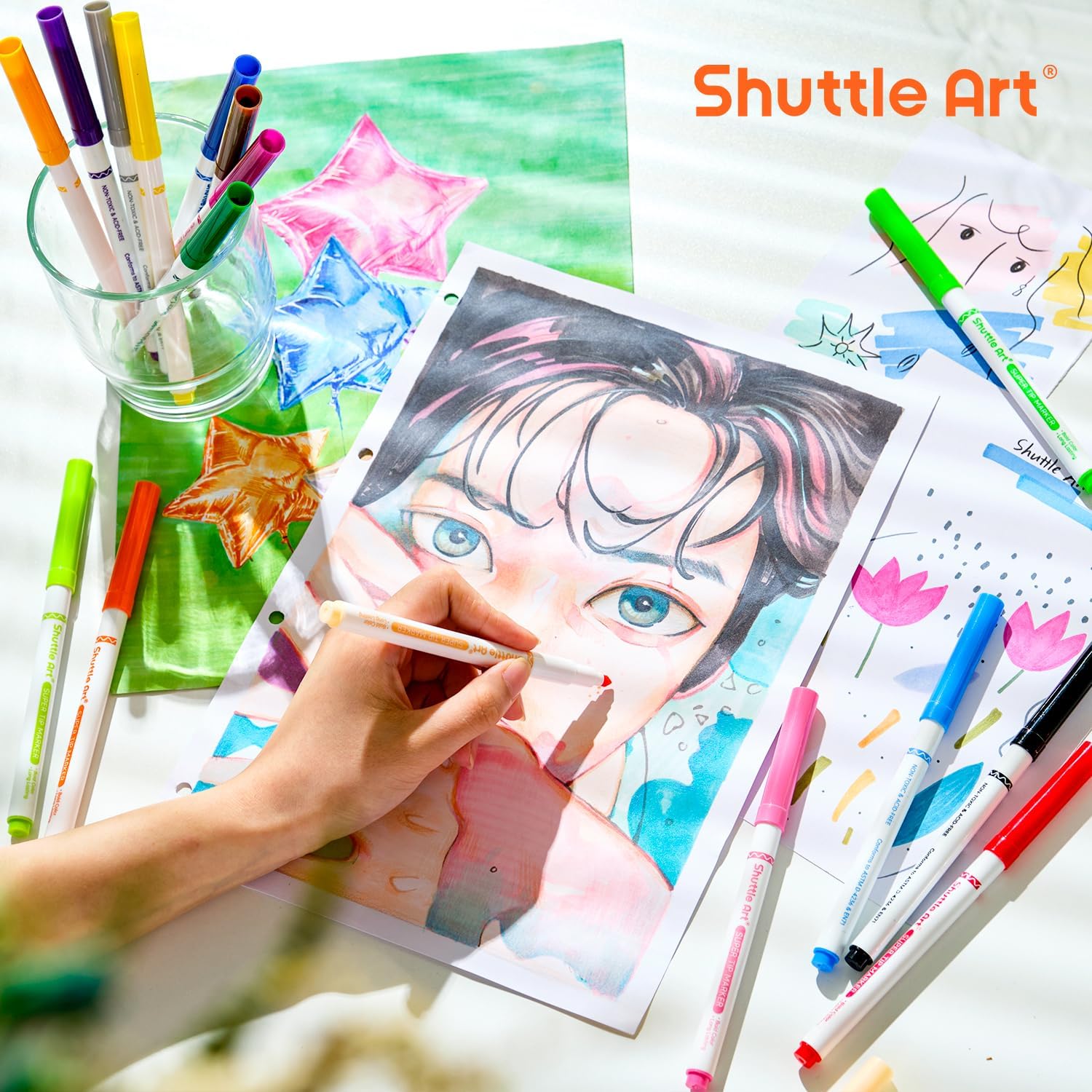 - LARGE VALUABLE SET: Shuttle Art 384 pack washable marker set comes in a box, containing 24 each of 16 different colors including red, orange, light orange, pink, nude, yellow, green, grass green, lemon green, sky blue, sapphire blue, purple, brown, plum, gray, black.