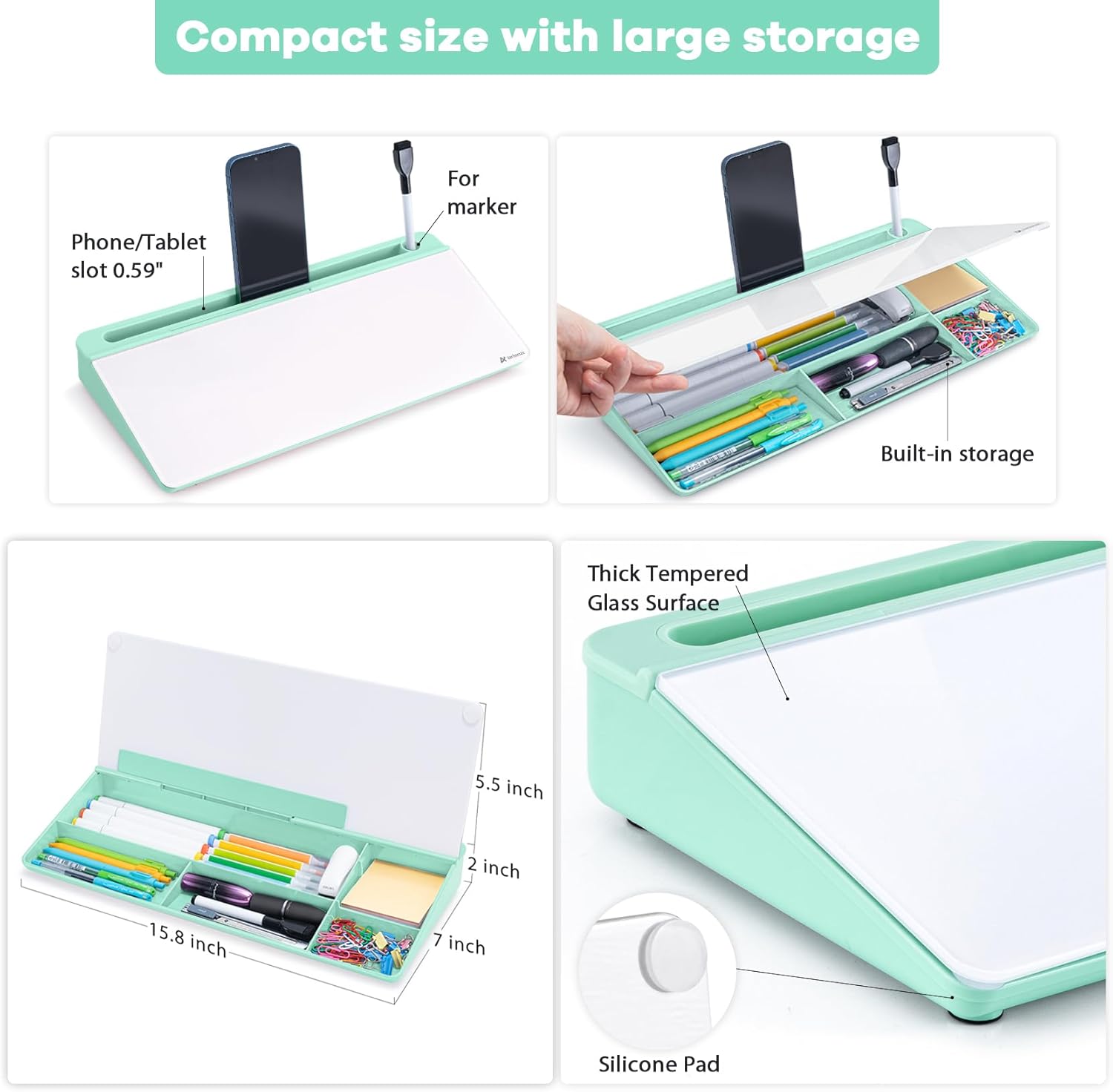 - Multi-function: Other than the glass board and built-in storage box, this product also has a slot on the top which can hold a phone or a tablet.