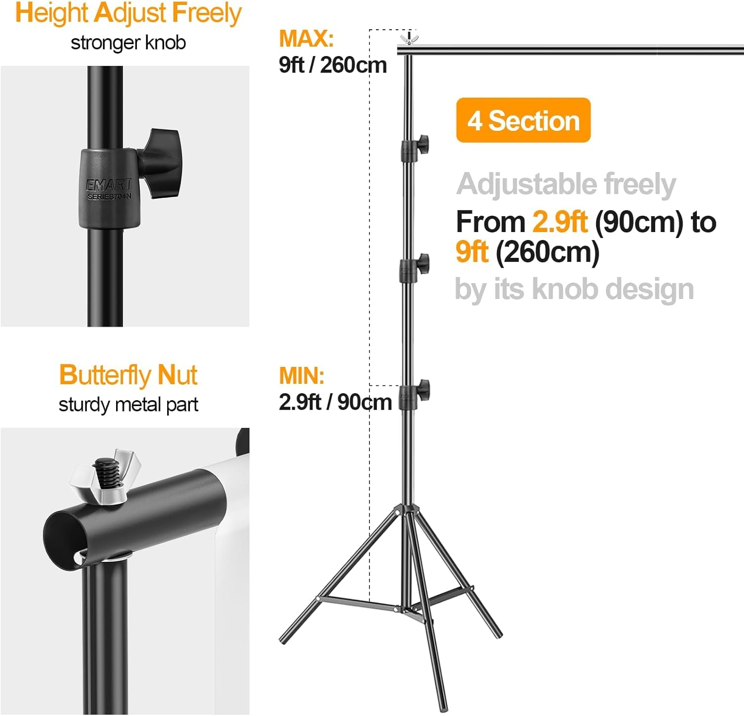 - 【Adjustable Height&Width】With adjustable height (2.9ft/90cm–9ft/280m) and width (5ft/1.5m-10ft/3m), the backdrop support system holds your backdrop in place and helps create different backgrounds for photography work.
