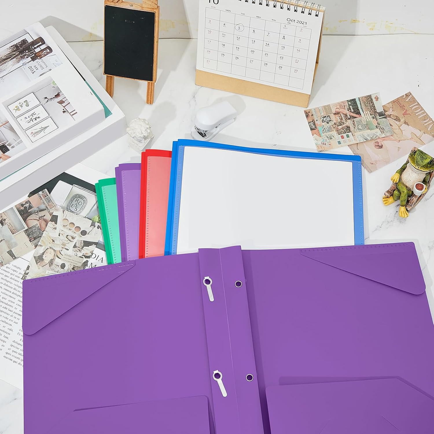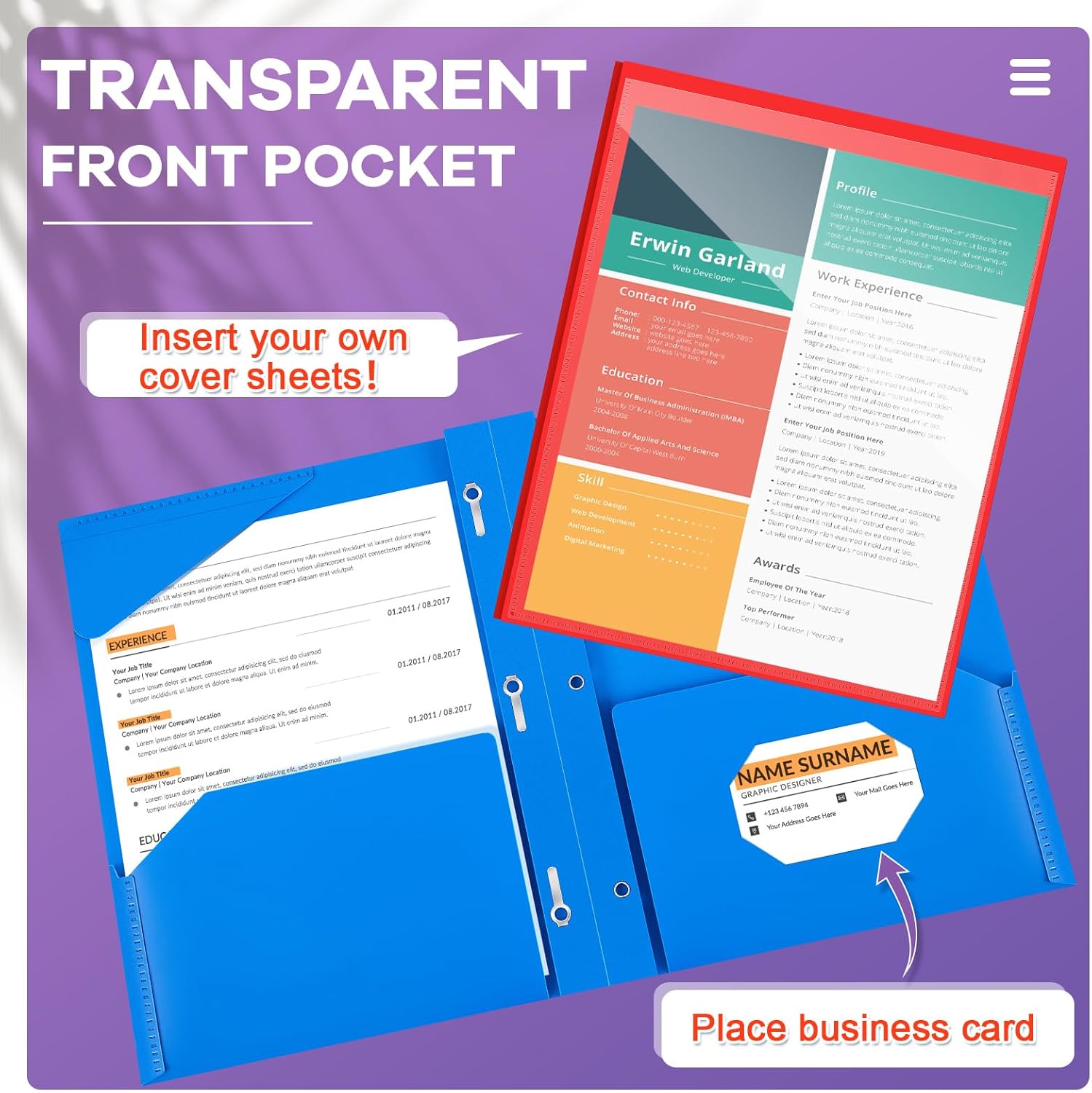 - Practical and Useful: with a clear front pocket, you can put your catalog, tables, favorite reports, presentations and more for clear display; Each plastic folder has 2 internal pockets to help organize and store your letter sized paper and documents; There are also 3 prongs to secure your 3-hole loose leaf paper in case it falls, and the card slot can hold your ID card or business card, practical for your daily work