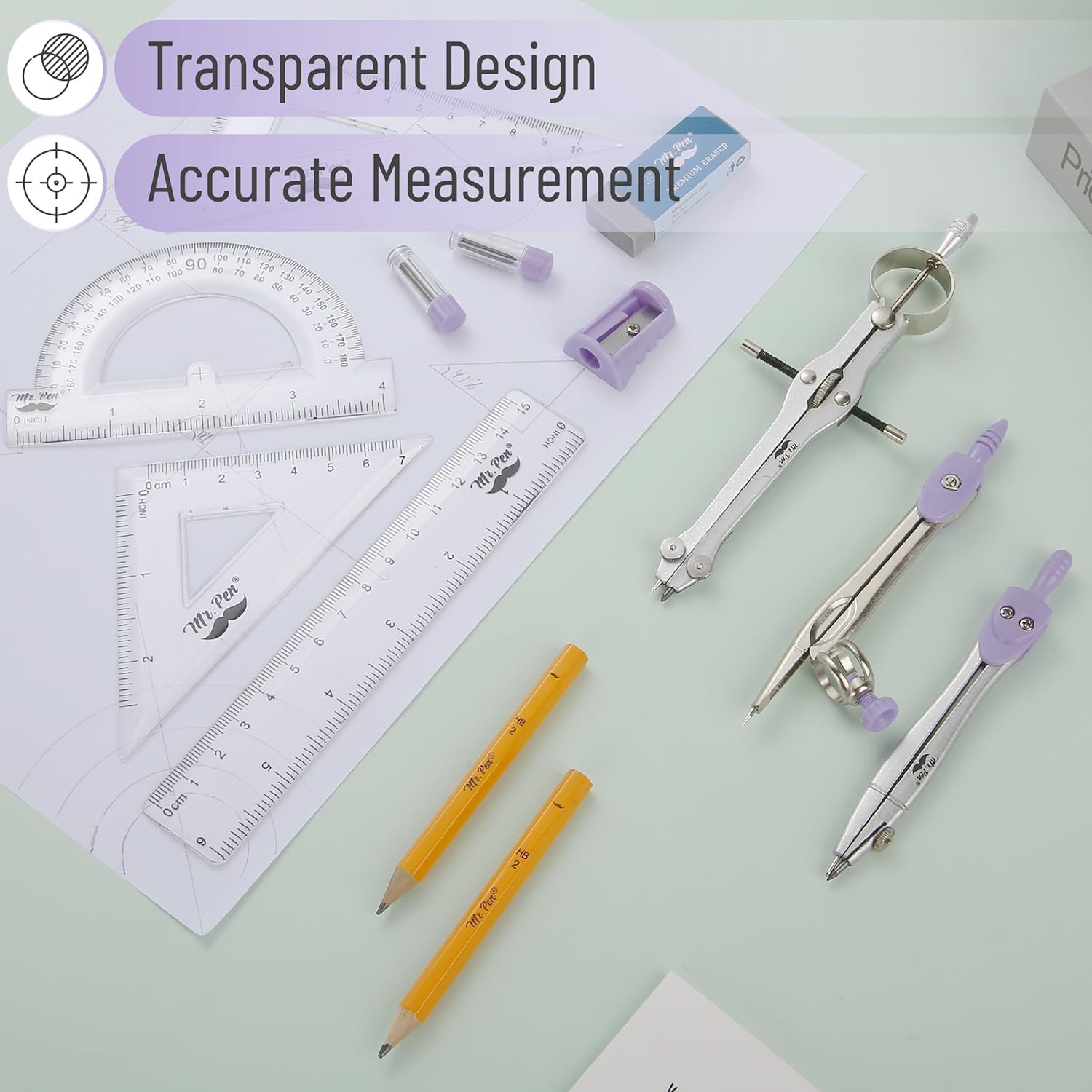 Mr. Pen- Geometry Set, 13 pcs, Compass for Geometry Compass, Geometry Kit Set with Shatterproof Storage Box, Math Compass, Geometry Set for School, Compass Math, Protractor and Compass Set, Purple