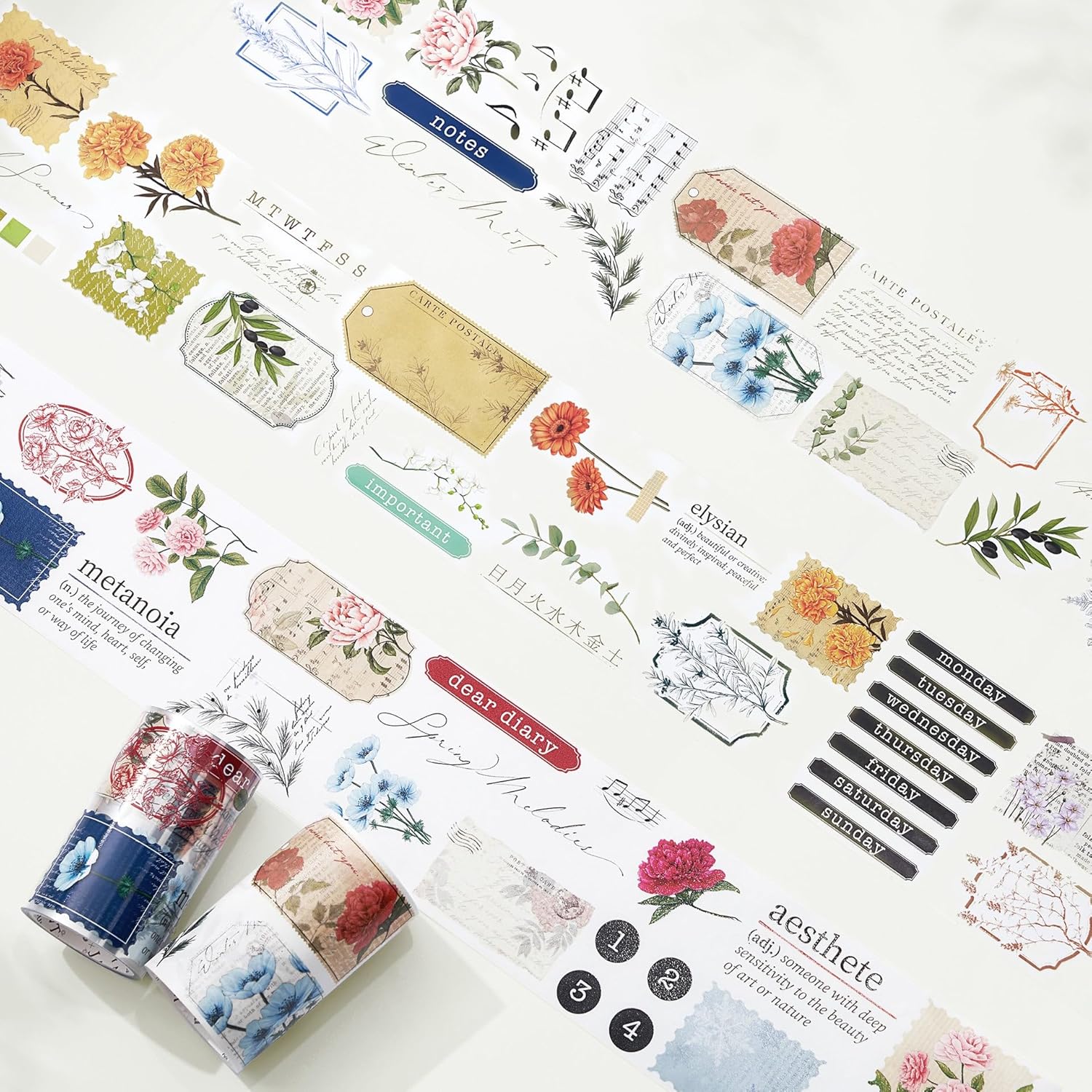 WT Season's Symphony Wide Clear PET Tape, Single Roll, Original Design, Vintage Watercolor Floral, Transparent Adhesive Tape for Journaling, Junk Journals, Bujo, Scrapbooks, Planners, DIY Crafts