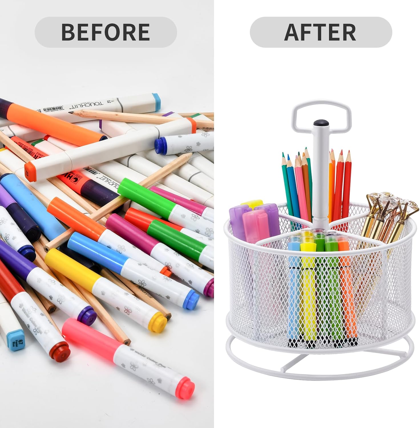 Marbrasse Mesh Desk Organizer, 360-Degree Rotating Multi-Functional Pen Holder, 4 Compartments Desktop Stationary Organizer, Home Office Art Supply Storage Box Caddy (White)