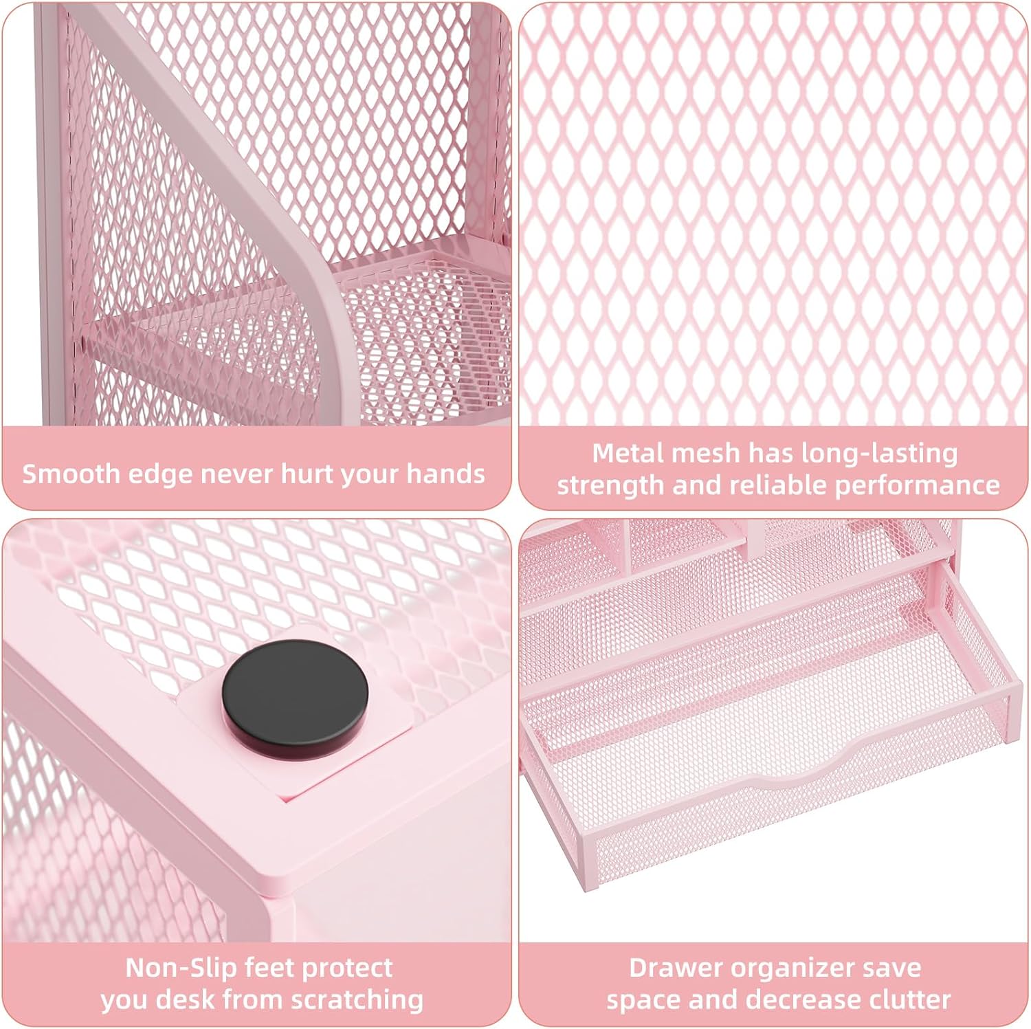 - 【STURDY AND DURABLE】: The desk storage is made of high-quality metal mesh and built with non-skid feet to make it incredibly stable, which is not easy to get rusty and thereby, keeping the pen holder brand new all the time. The extremely smooth edges will not hurt your things or yourself. for meeting all your demands for home and office use.