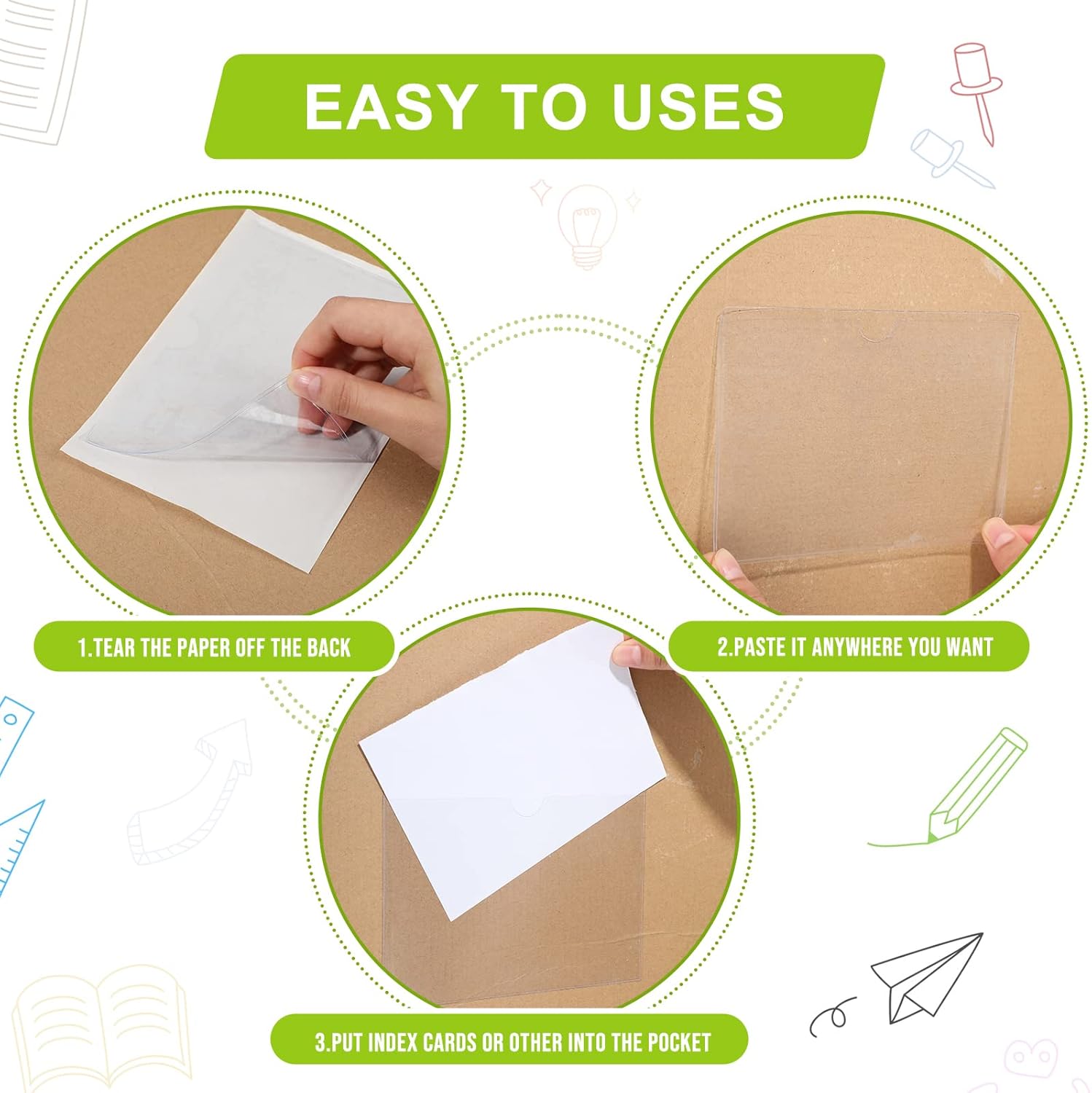 - Stay Organized: the self adhesive index card pocket can keep order by inserting your cards into plastic sleeves and attaching them wherever you need them; Our self-adhesive cards are suitable for making library labels, self adhesive name tags for classroom, toy labels for bins with pictures, labels for plastic storage bins and other