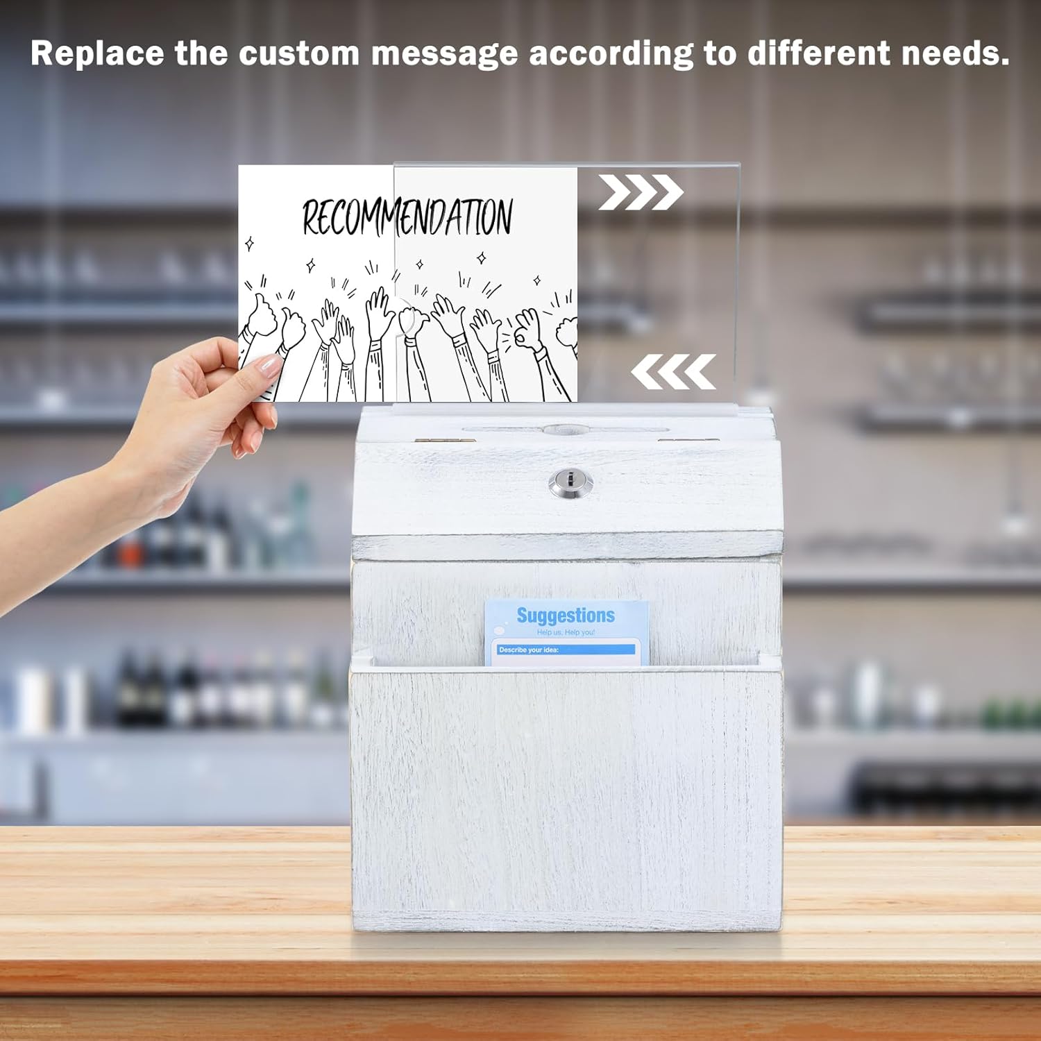 KYODOLED Wood Suggestion Box with Lock, Rustic White Ballot Box Donation and Key Drop Box with Acrylic Sign Holder and 30 Free Suggestion Cards, Wall Mounted or Freestanding, 9H x 6.9W x 8.5L Inch