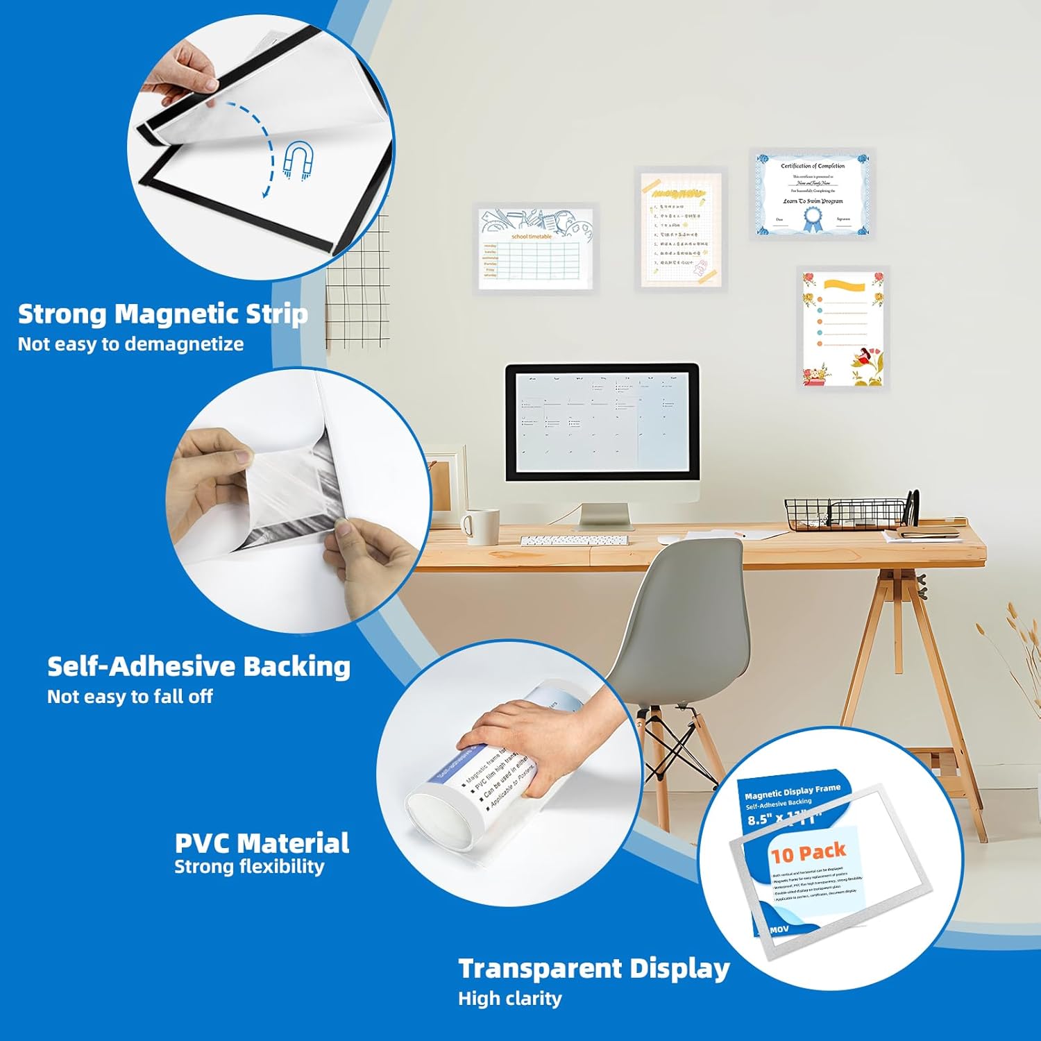 Magnetic Sign Holder 8.5 x 11-10 Pack Double Sided Magnetic Picture Frames for Wall Window Display Frame Paper Poster Document Holder Reusable Adhesive Frames for Refrigerator Glass Door