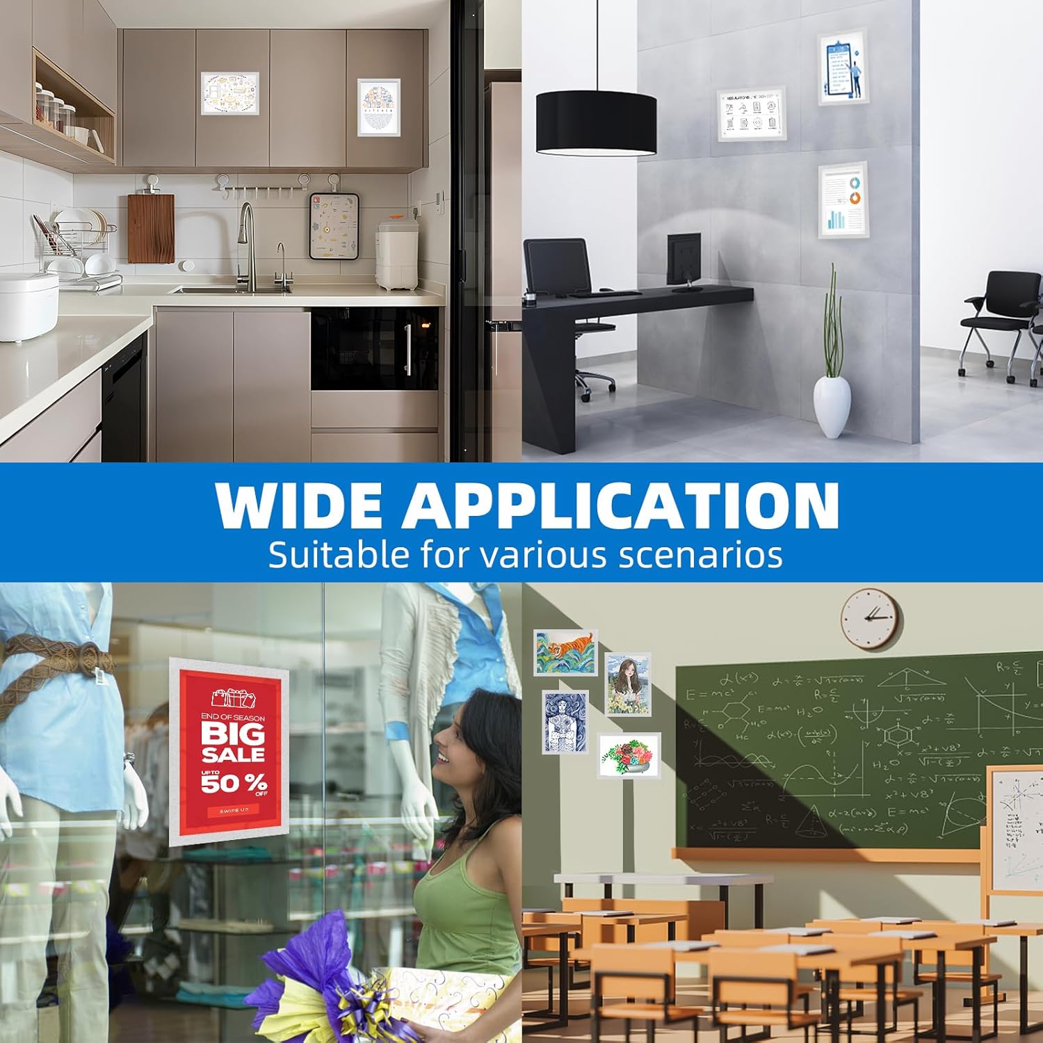 - 【MULTI-PURPOSE ADHESIVE FRAMES】The magnetic document holder is widely used in store, home, office, school, restaurant, factory, hotel for displaying poster, certificate, price list, photo, memo, etc. Delivery includes 10 pack magnetic frames for wall.
