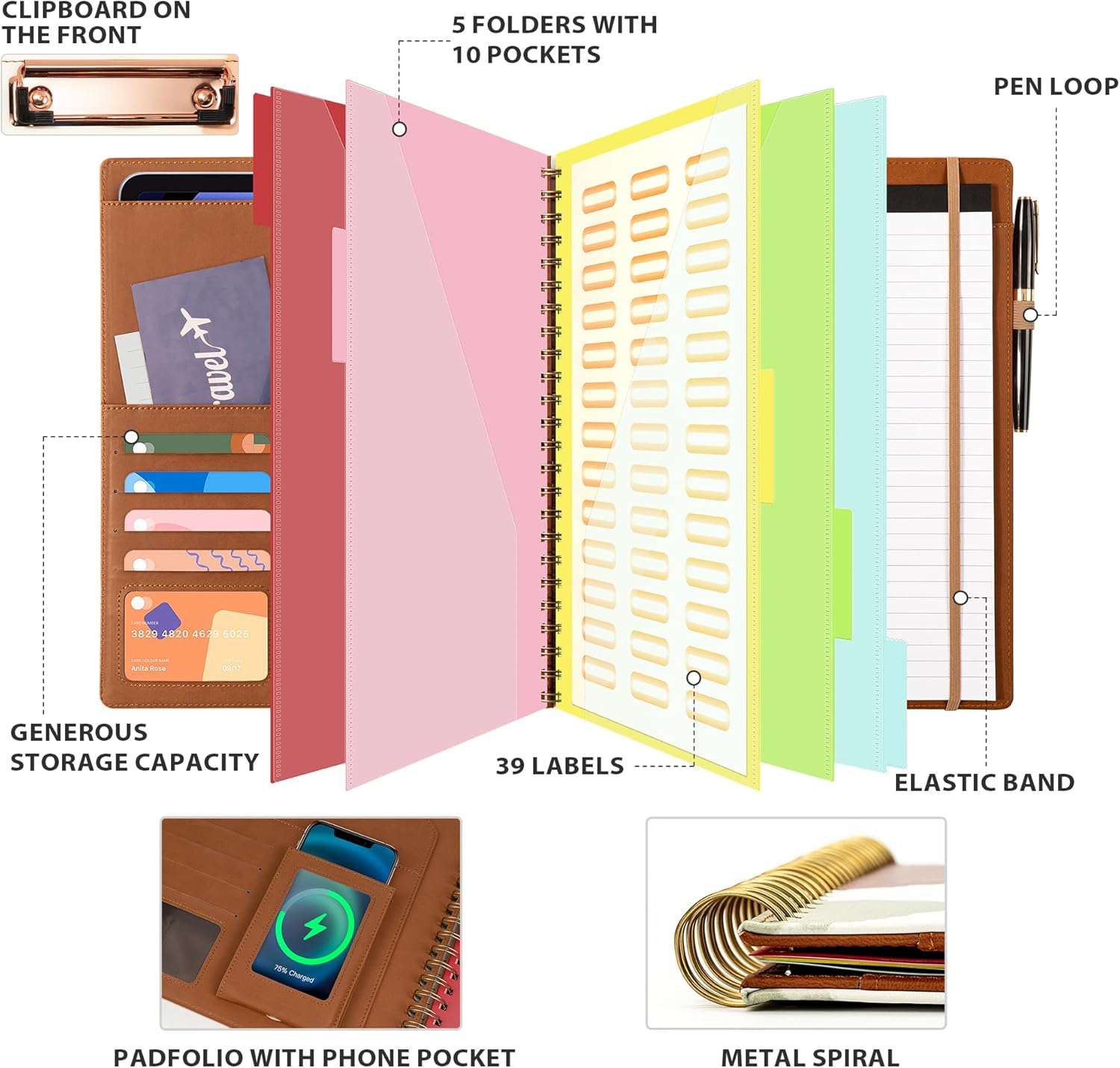 Clipboard with Storage for Men Women, Leather Padfolio Portfolio Organizer 5 Folders with 10 Pockets, Spiral Clipboard Folio with Notepad for Letter Size, Elastic Closure and Pen Loop Brown