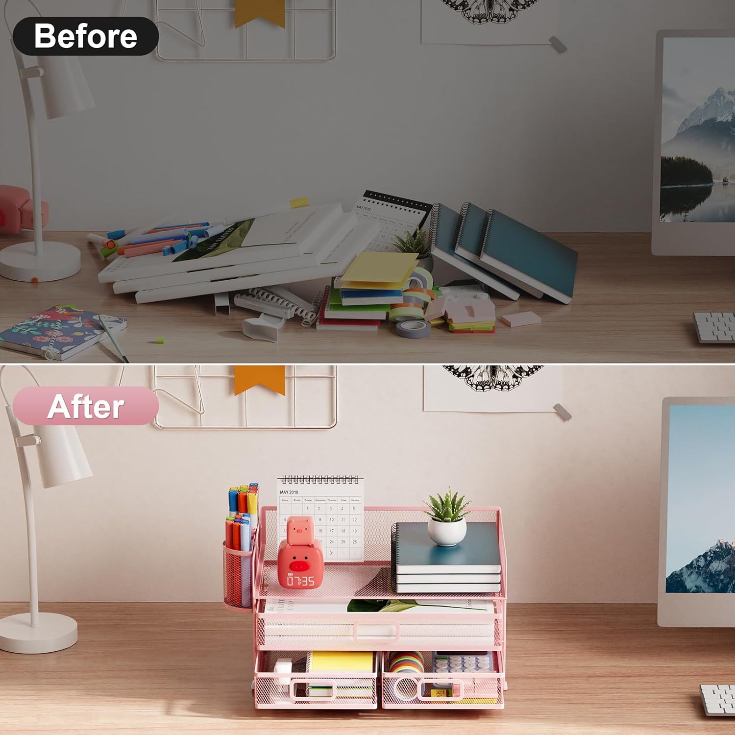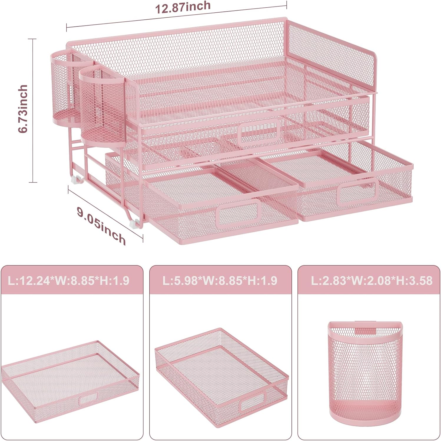 Marbrasse 3 Tier Mesh Desk Organizer with Drawer, Multi-Functional Desk Organizers and Accessories, Paper Letter Organizer with 2 Pen Holder for Home Office Supplies (Pink)