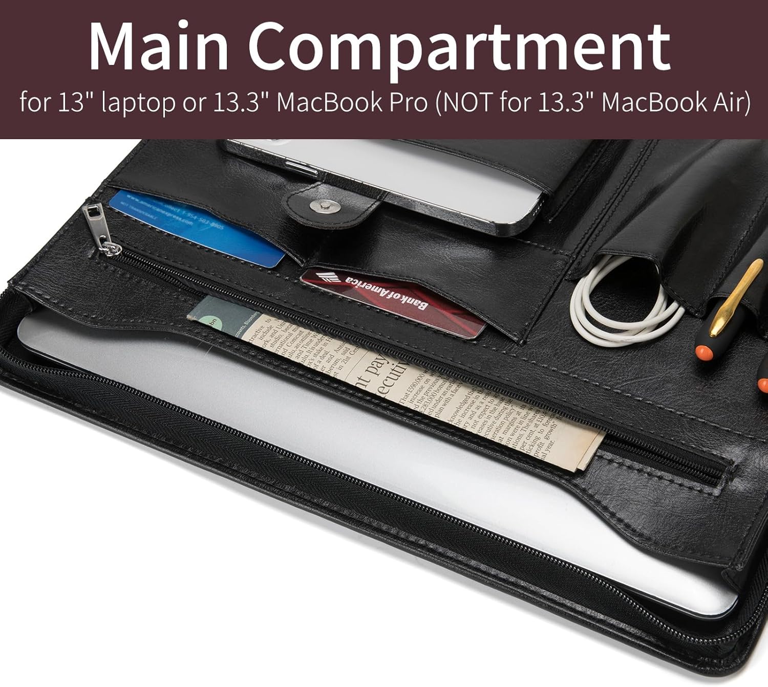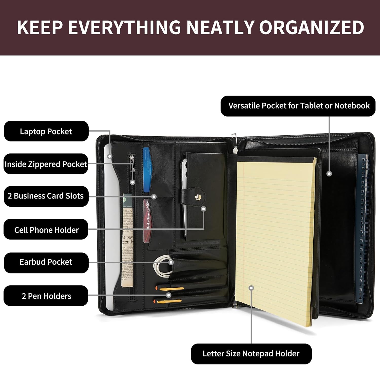 - Effortless Organization: To enhance your daily efficiency, this leather portfolio includes 2 pen loops for easy access to writing instruments, 2 business card slots for networking essentials, an earbud pocket for tangle-free earphone storage, and a dedicated cell phone holder, ensuring all your essentials are readily accessible and neatly organized. Say goodbye to disorganized bags and hello to a more streamlined and efficient workday.