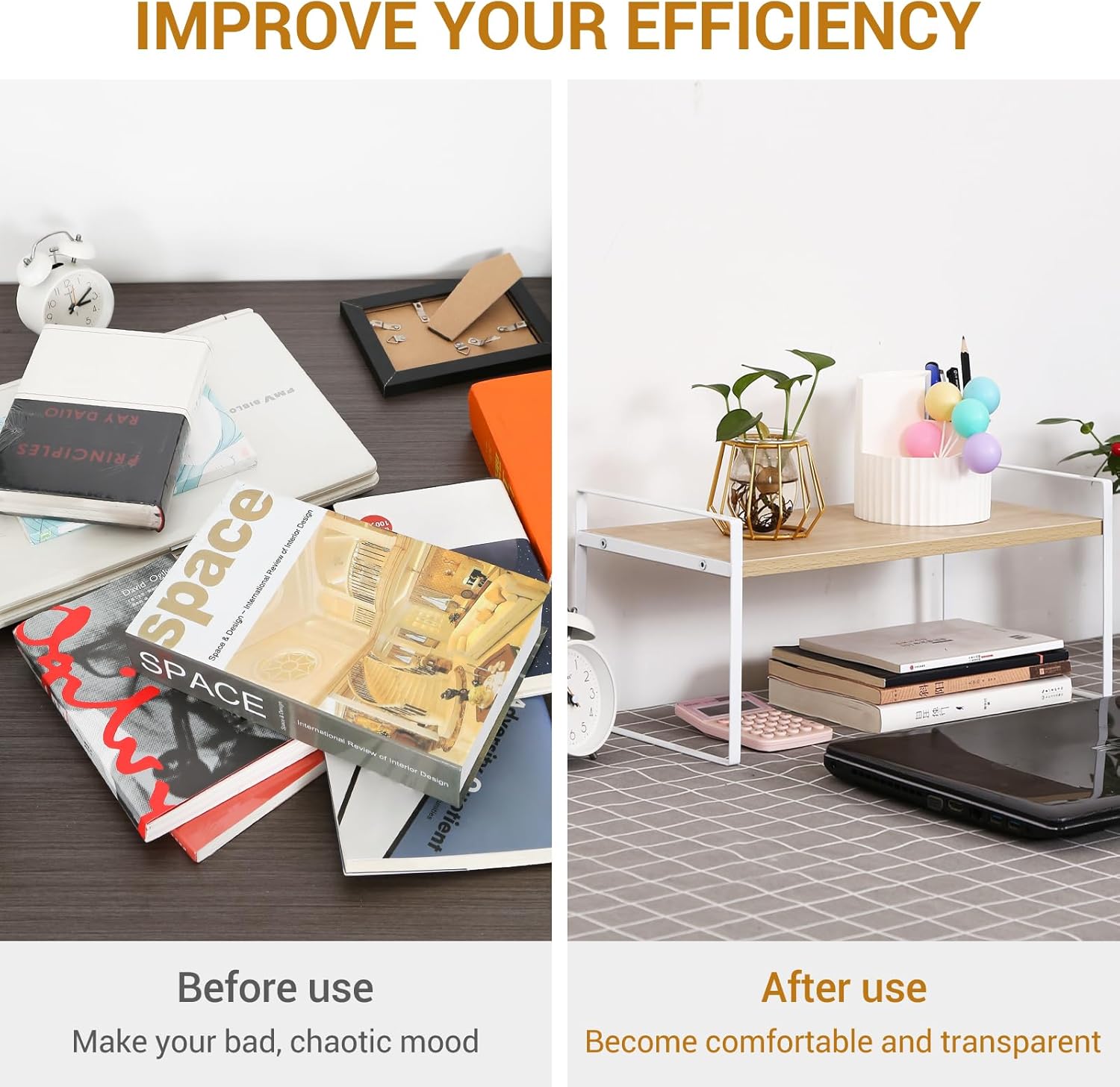 - 1.High-grade material, healthy and durable: Our office desk shelf organizer and accessories are made of high-grade wood material, which is stronger than traditional wood, even if there are hollow patterns on both sides, the desktop shelf will not reduce the strength of the shelf. No paint is used on this office desk shelf organizer and accessories, let you have a healthy working and living environment