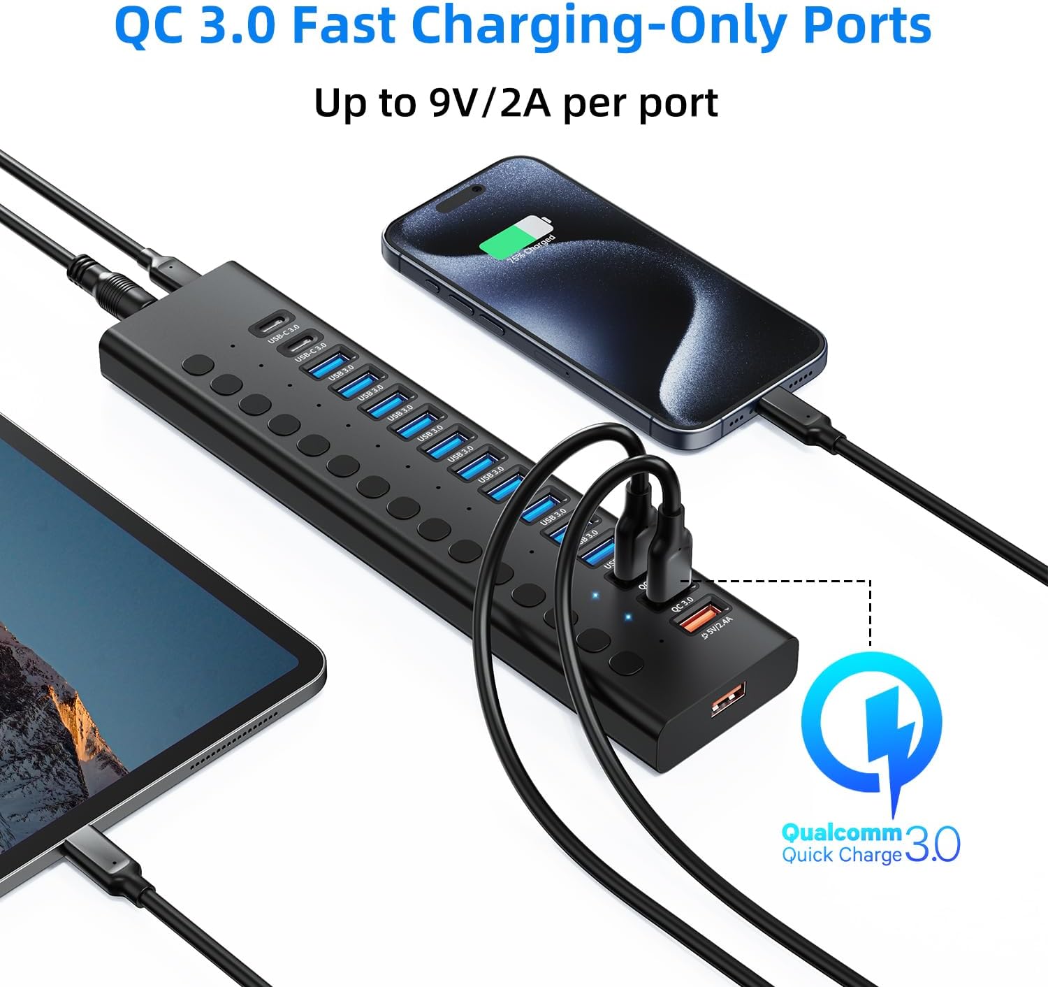 Powered USB 3.0 Hub, 16-Port USB C Hub Splitter (10 USB 3.0+2 QC 3.0+2 Smart Charging+2 USB-C 3.0) with Individual Switches, 12V 7.5A 90W UL Certified Power Adapter for Laptop, Mac, PC, Computer