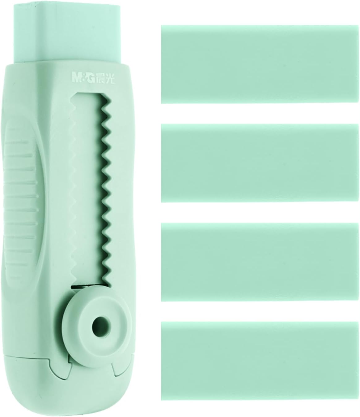 - 【Package Includes】: Our M&G package included 1pcs green push-pull retractable eraser with plastic sleeve and 4 refill erasers(2.17 x 0.75 ‘’), suitable for remove pencil marks in most scenarios. With five erasers you'll probably lose them before you use them all up.
