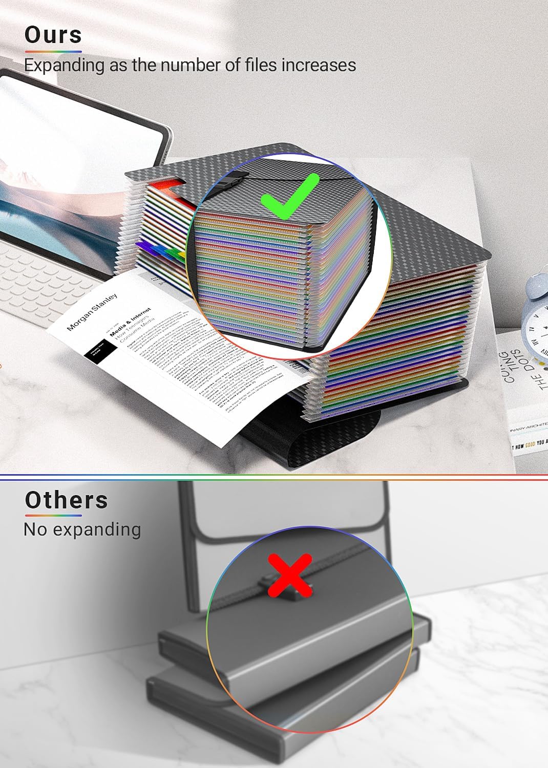 - ✔【STURDY MATERIALS】Expandable file folder are made by high quality polypropylene and polyester, 20% and more thicker than other file organizer, it can stand on the desktop independently, no easy to be broken and deformed. 100% Waterproof, Non toxic, Non Odor, Anti-wear, tear and Moisture resistant.